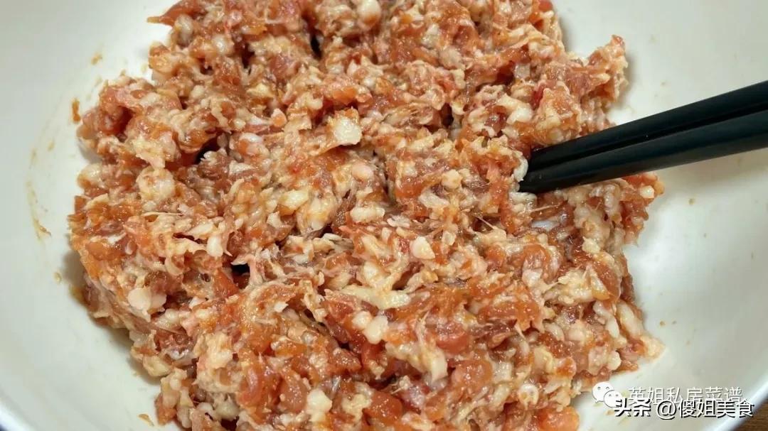 第二步:調肉餡,這是靈魂!肉餡好不好喫,全在調餡這一步!把剁好的肉餡放到大碗裏,先加蔥薑末,去腥增香,孩子不愛喫蔥姜的,可以把蔥姜泡成蔥姜水,分次加到肉餡裏,一樣提鮮,還喫不到蔥姜渣。然後加調料:1勺生抽、1勺蠔油、少許鹽(別多,醃角瓜的時候已經加鹽了)、一點點十三香,順着一個方向攪拌,攪到肉餡上勁,就是感覺肉餡變黏了,能掛在筷子上那種。
