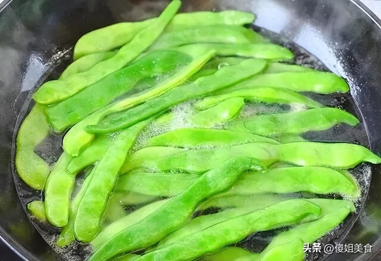 鍋裏燒一大鍋開水,丟進去一小勺鹽和幾滴油,鹽能讓芸豆更入味,油能鎖住顏色。水開後把芸豆倒進去,大火煮個3-5分鐘,直到芸豆變得翠綠,用筷子一夾能輕鬆斷開,就趕緊撈出來。