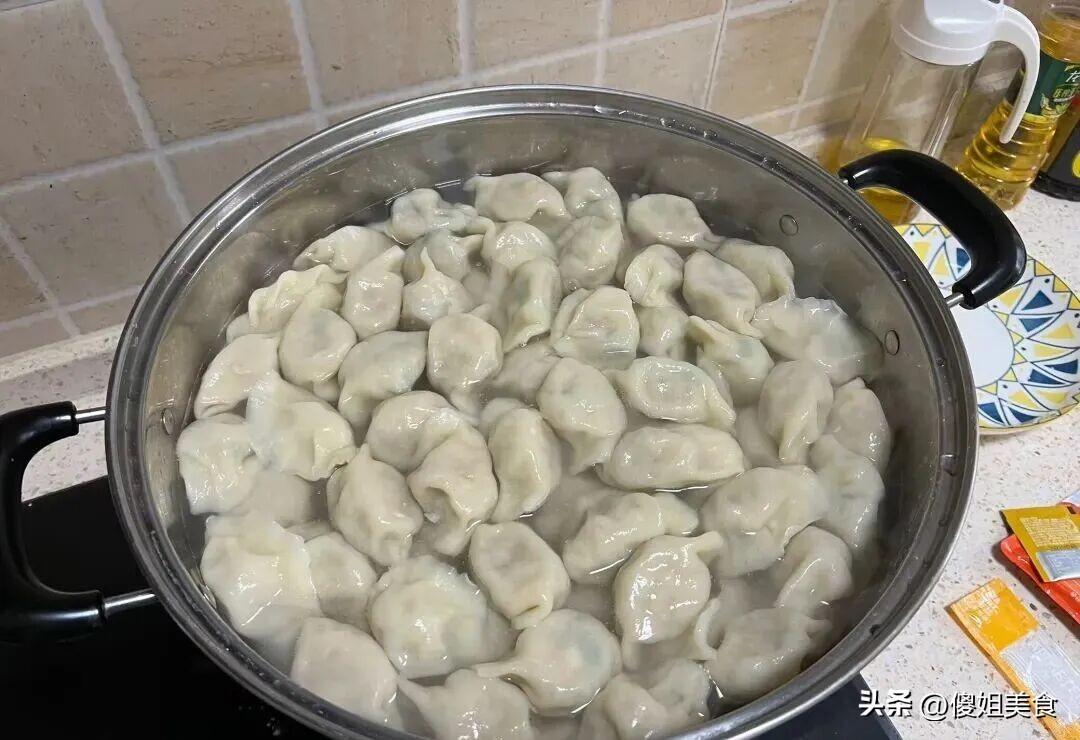鍋裏燒一大鍋水,水開後下餃子,用勺子背輕輕推一下,防止粘鍋底。等水再次沸騰,點一次涼水,再開再點,重複兩次,餃子都浮起來,肚子鼓鼓的,就說明熟了。