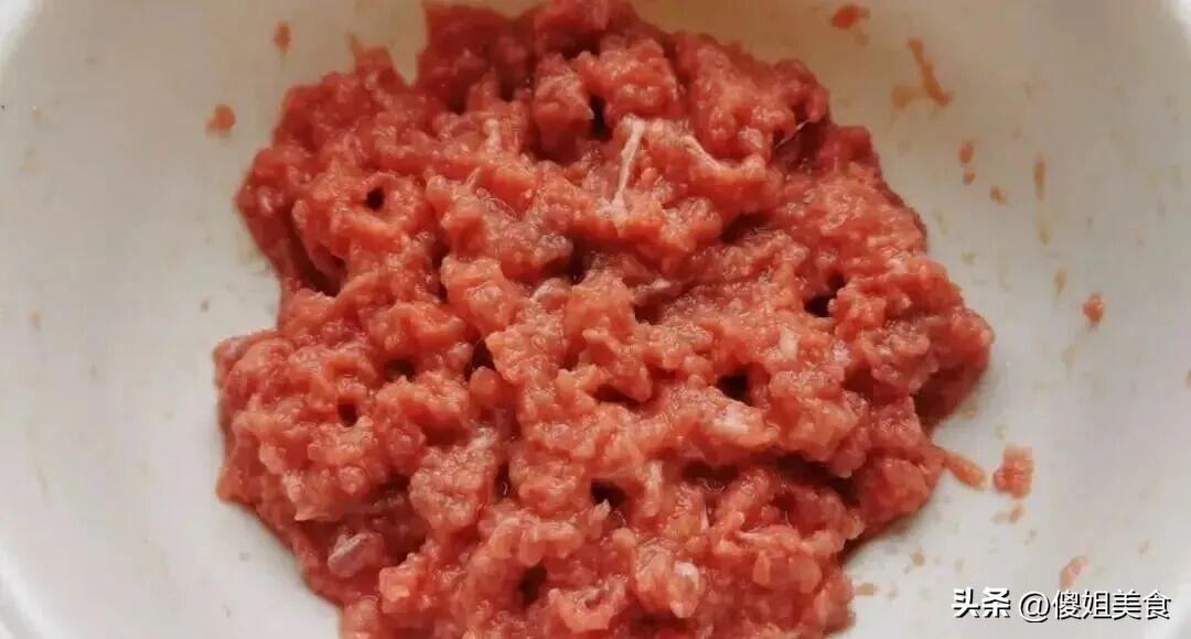 第二步:餡餅好不好喫,全看餡料調得咋樣。牛前腿肉洗淨,去掉筋膜,切成小丁,再用刀剁成細膩的肉餡。放進大盆裏,加薑末、1勺生抽、1勺蠔油、少許白胡椒粉,順着一個方向(順時針)快速攪拌,攪到肉餡變得粘稠上勁,能抱團不鬆散就停。