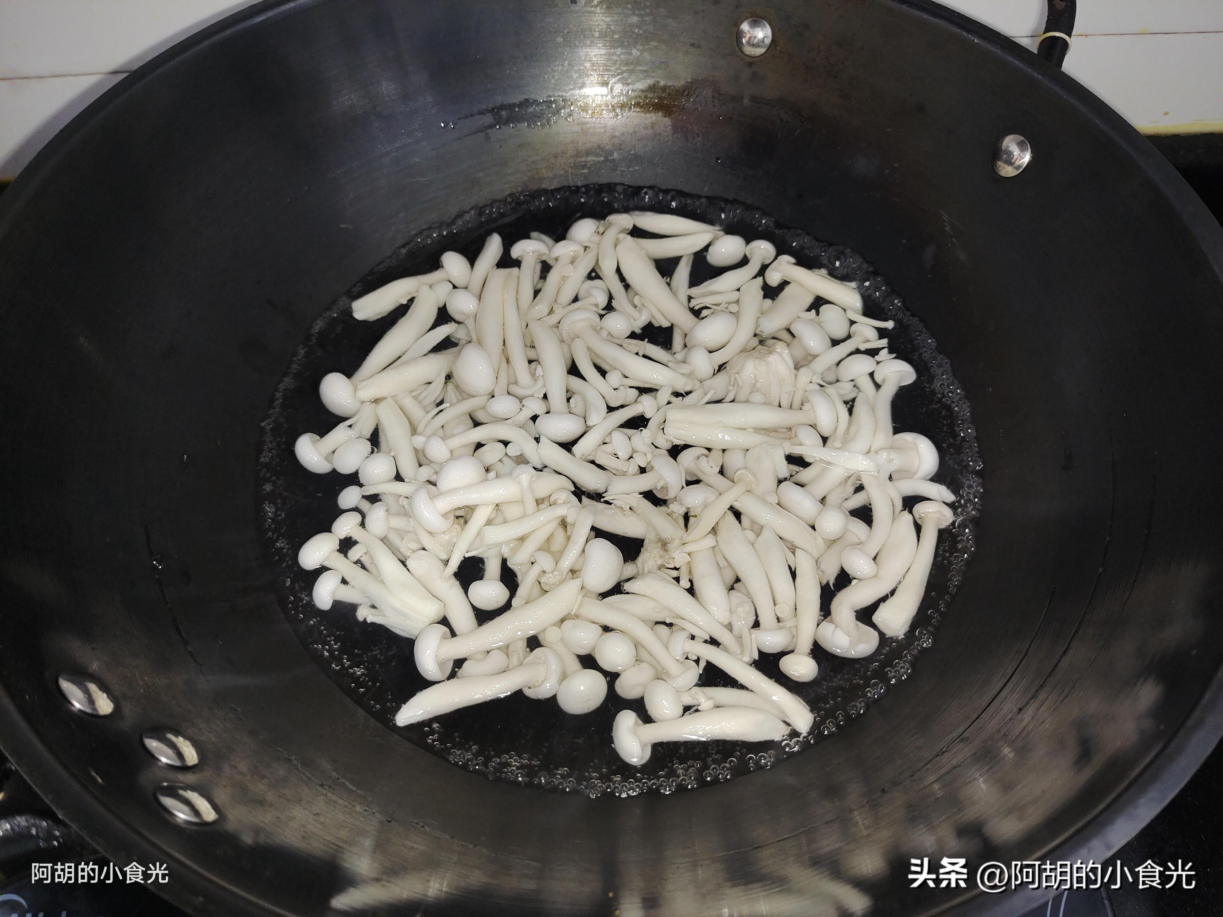 第一步:今天的主要食材就是鮮豌豆,挑選飽滿的豌豆莢,直接去殼留下豌豆粒,簡單清洗乾淨後置於一邊控幹水份待用。另一個食材就是白玉菇,沒有的也可以用口蘑來代替,切掉根部後淘洗乾淨,而後開水下鍋焯燙一分鐘後撈出,用勺子按壓擠一擠水分後待用。