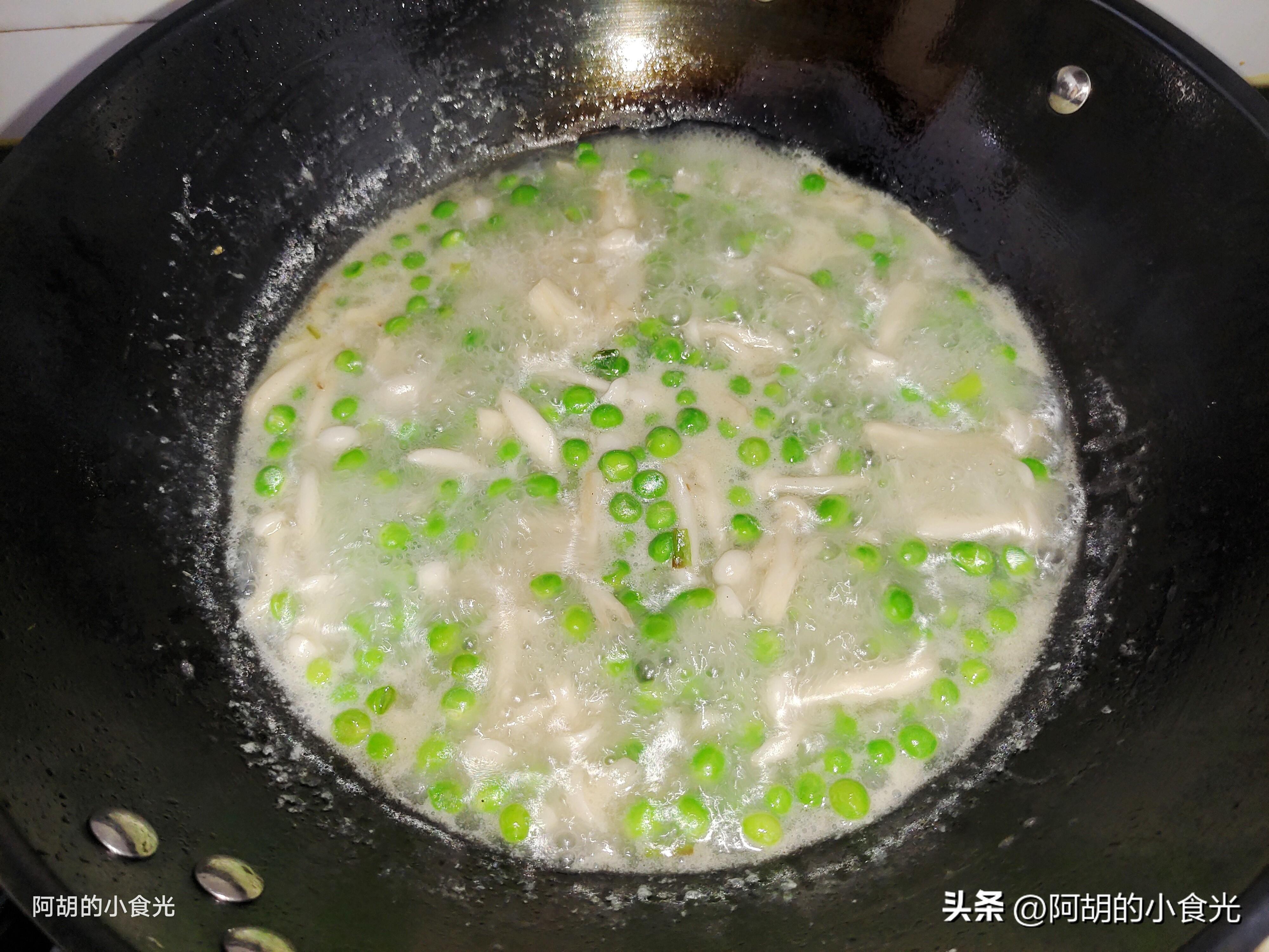 第六步:最後用涼水稀釋少許的幹澱粉,將澱粉水淋入鍋中,同時鍋內保持大火攪拌均勻,讓湯汁略帶少許的稠度即可,千萬不要太過濃稠了。勾芡完畢後就可以出鍋裝盤了,簡簡單單的一道開胃菜,小海鮮的鮮、蘑菇的鮮、豌豆的鮮共同搭配出這道鮮爽好菜,就用來拌米飯,妥妥的下飯好菜,感興趣的一定要試一試這個做法。