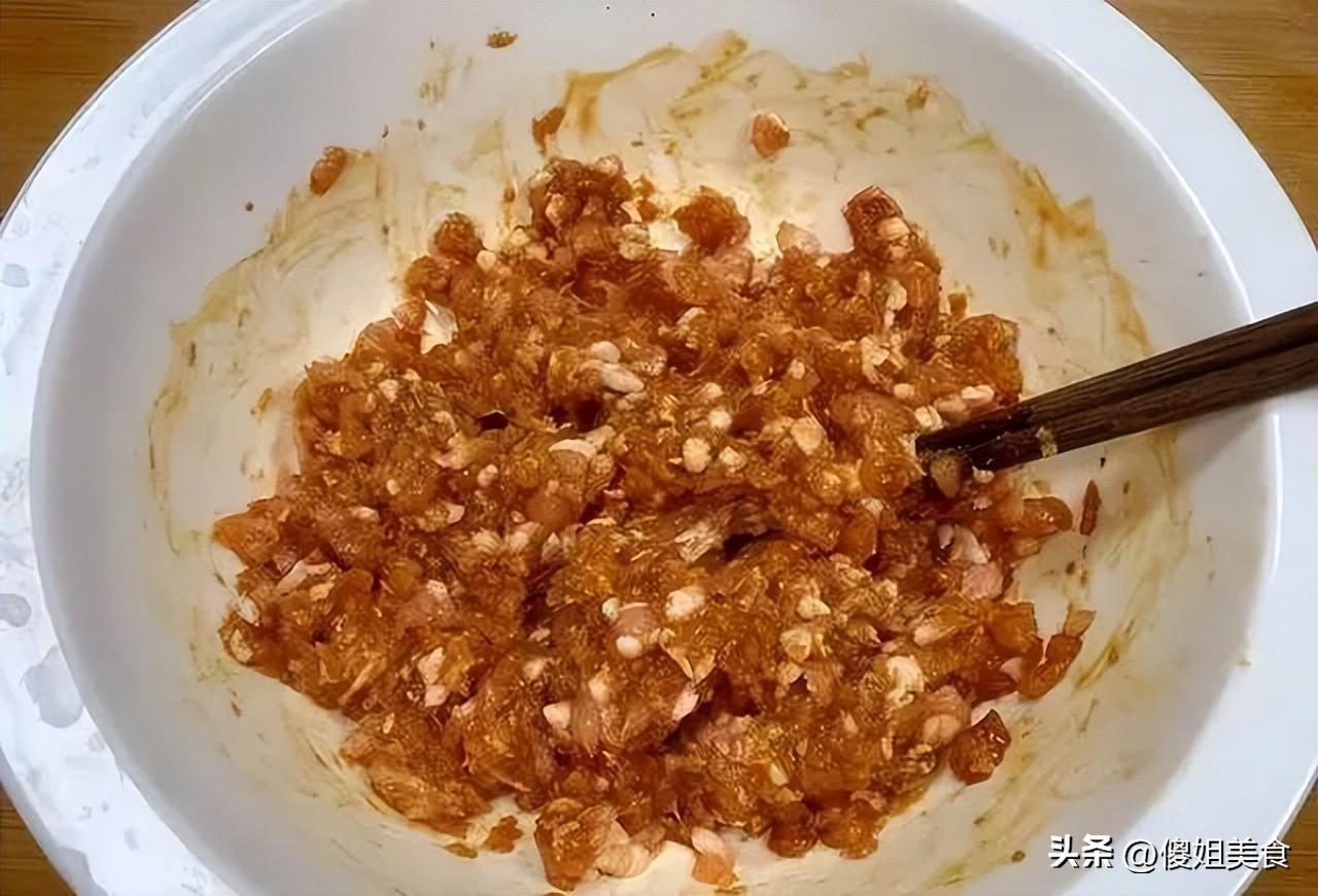 第四步:剁好的肉餡放進大盆裏,先加一勺生抽、半勺老抽、一勺蠔油,適量鹽、食用油,順着一個方向攪拌均勻,讓肉餡醃製入味。