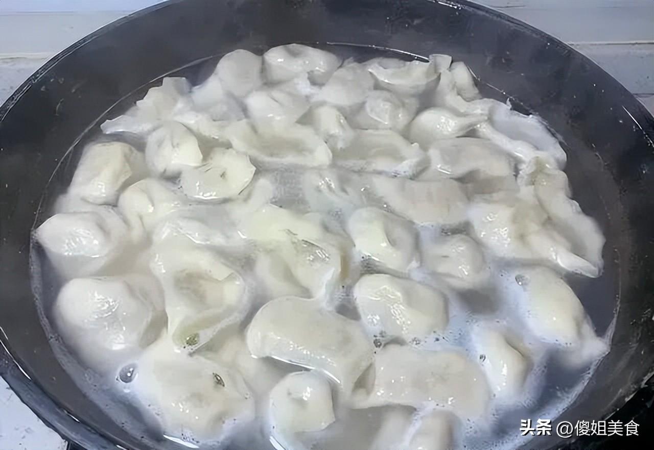 第七步:鍋里加足量清水,大火燒開,水開後把餃子下鍋,用勺子背面輕輕推着攪一攪,防止餃子粘鍋底。等水再次沸騰,往鍋裏倒半碗涼水,蓋上鍋蓋繼續煮;重複這個“點水”的動作三次,直到餃子全部浮在水面上,肚子鼓得圓圓的,麪皮變得透亮,就說明熟了。