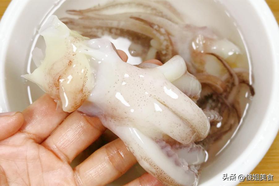 【具體做法】1、把八爪魚的頭部剪開,裏面的墨囊、眼睛、硬嘴全都摳出來扔了,這些地方是腥味的重災區,一點都不能留;第二步,給八爪魚來個“鹽搓按摩”,倒一勺粗鹽在八爪魚上,用手反覆揉搓,把表面的黏液搓乾淨,黏液去幹淨了,腥味才能徹底去掉,搓完用清水反覆沖洗三遍,直到水變清澈;第三步,把洗乾淨的八爪魚切成段,大小控制在3釐米左右就行,別切太小,炒完會縮,切太大又不容易熟,均勻切好備用。
