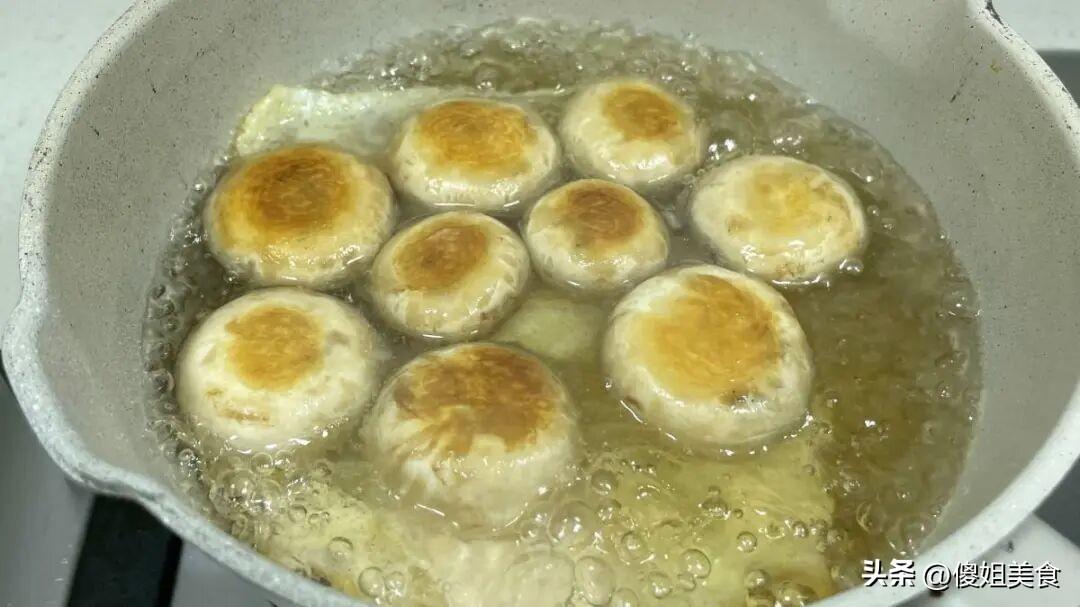 第一步:鍋裏放一點點油,開小火,把口蘑一個個擺進去,菌蓋朝下慢慢煎。彆着急翻,等一面煎到微微發黃,能聞到一股濃濃的菌香飄出來,再翻個面煎另一面。