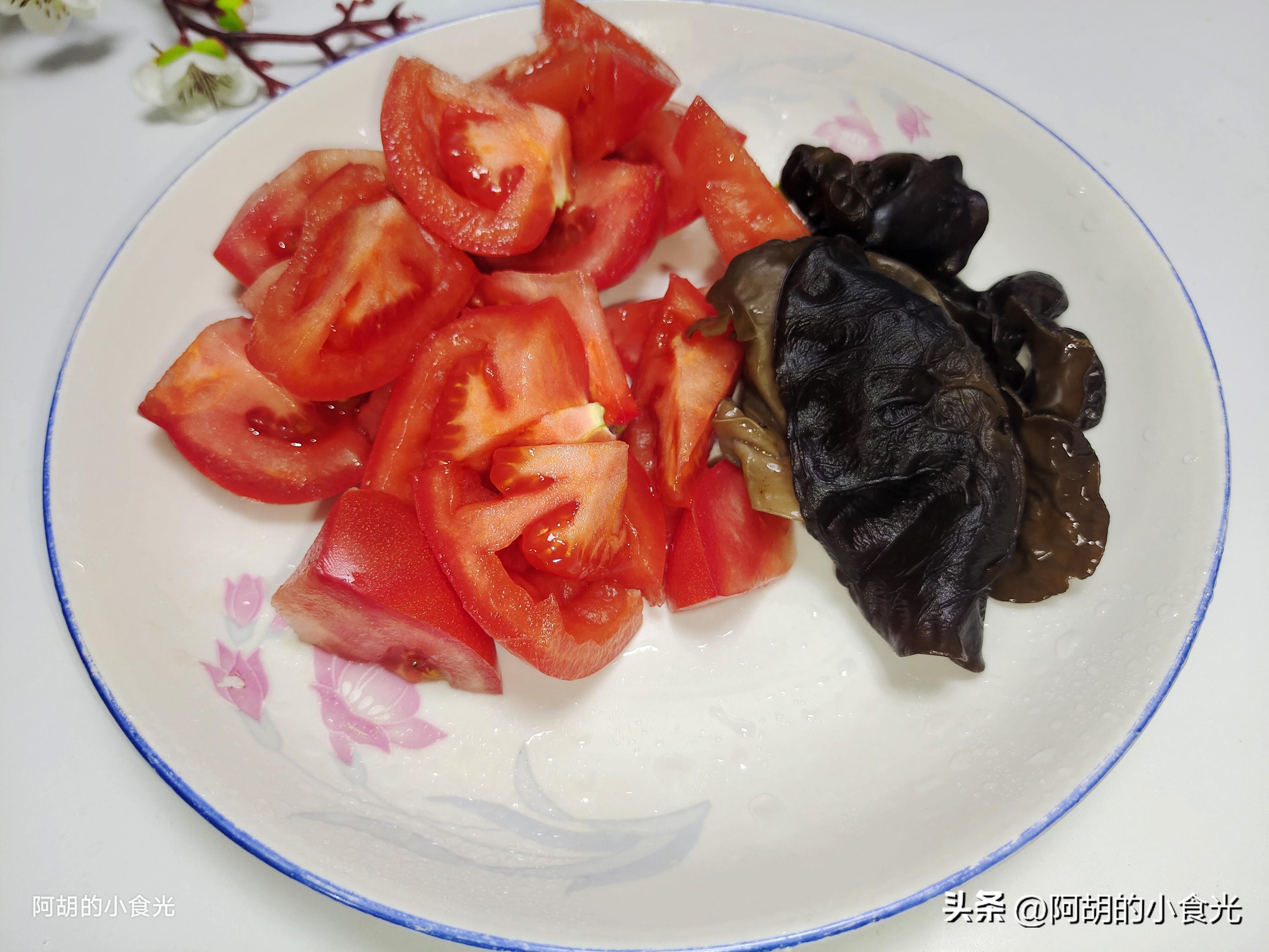 第二步:另外的主要食材就是兩個西紅柿,切塊後備用,喜歡的可以再搭配少許的木耳用涼水泡發後備用,還有就是三個雞蛋攪散,一些小料蔥蒜末即可。