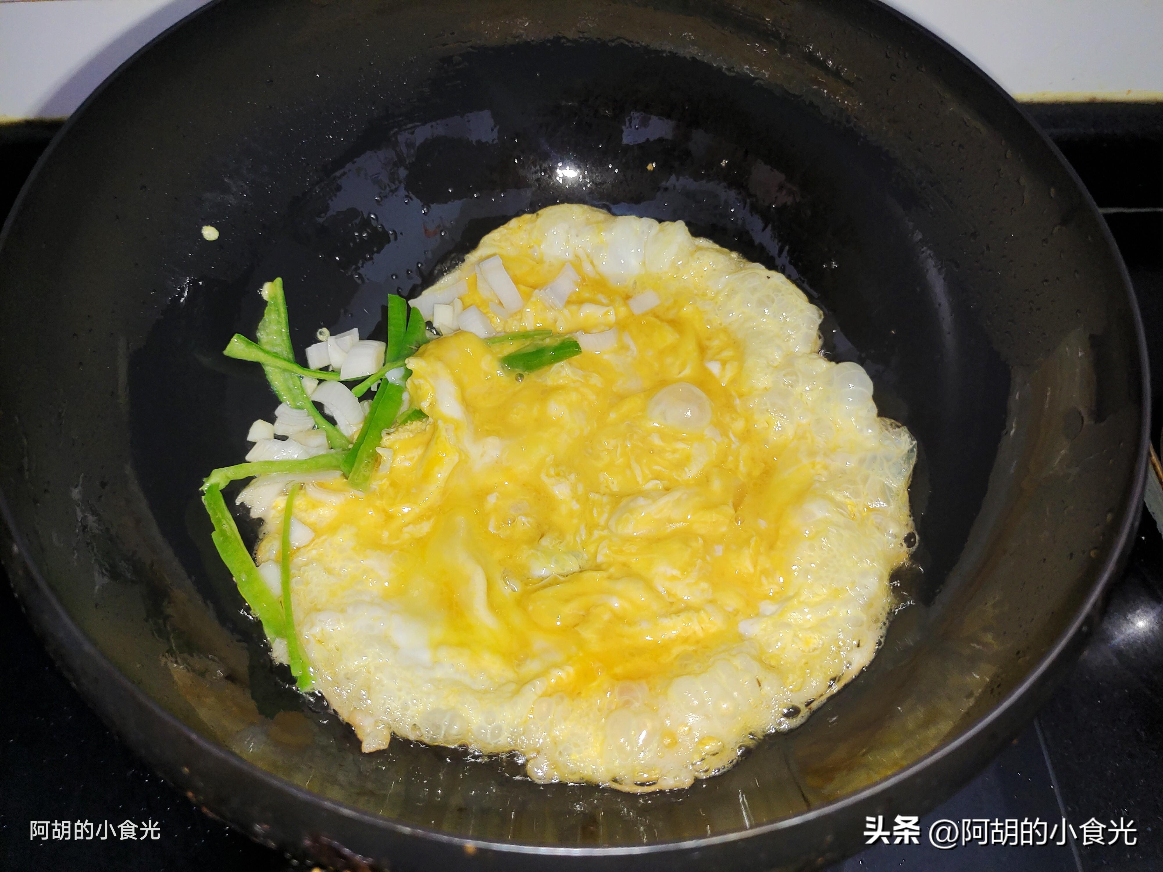 第三步:食材很簡單,備好後就可以開火烹飪了。小火把鍋烘乾後淋入一些食用油,也可以適當地加入一些豬油更好,燒熱後直接把雞蛋液倒入熱油中,煎炒至定型後加入蔥蒜一塊炒出香味。