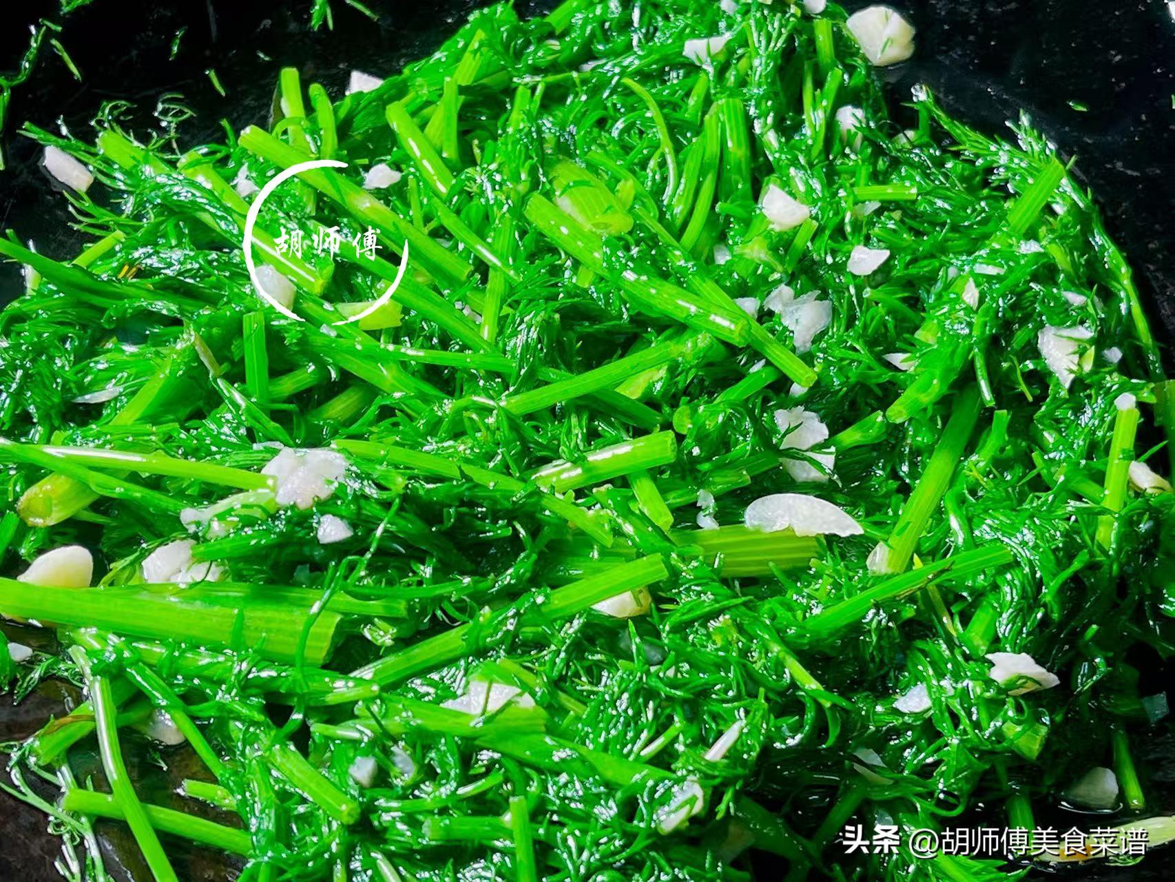 2、炒香絲菜時,一定要多放一點蒜,蒜放少了,香絲菜只有茴香的香味,沒有蒜的香味,蒜香和茴香兩種香味結合在一起,才能使這道菜更好喫。