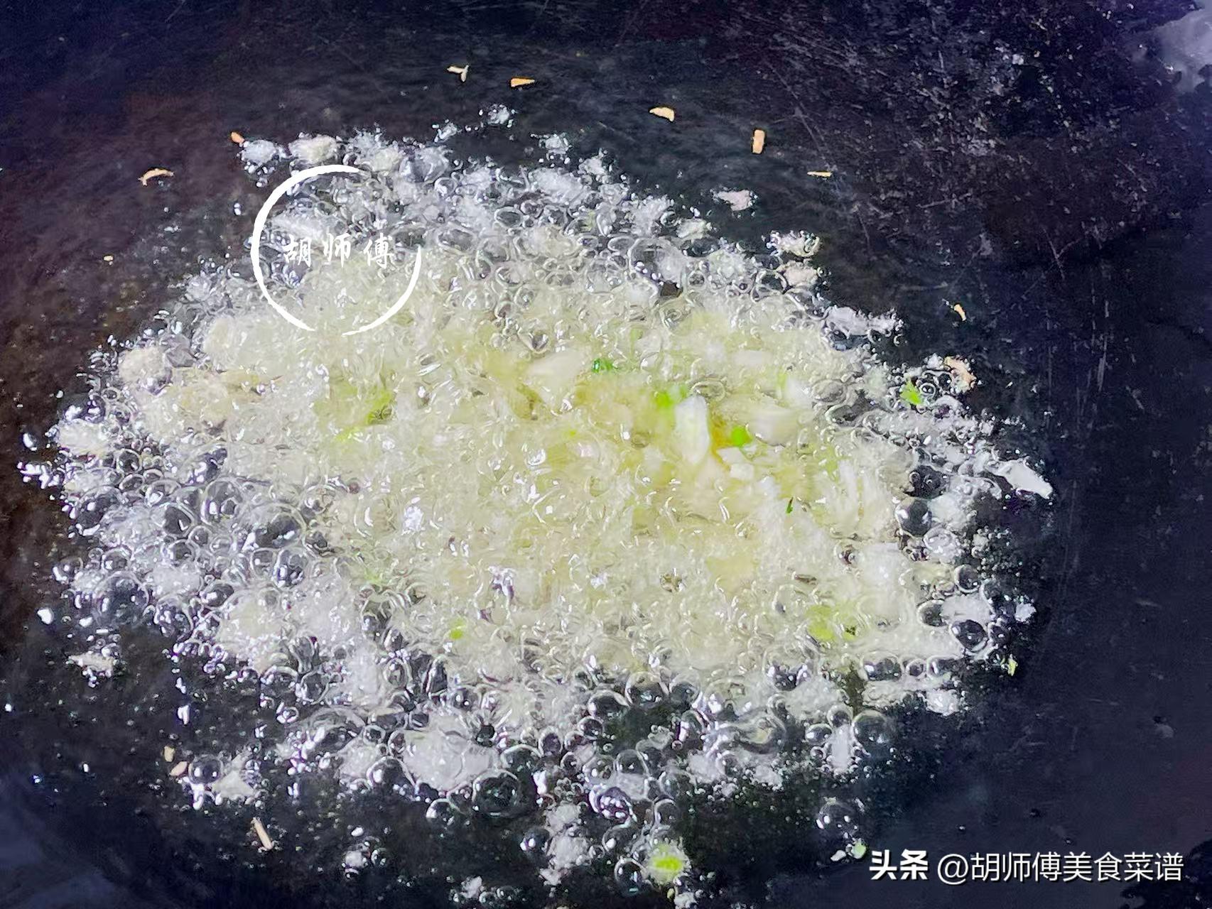 第三步:把鍋燒熱後,放入一勺花生油放入鍋中,等油溫燒到5成熱後,將蒜末放入鍋中,中小火將茴香炸15秒,徹底的激發出大蒜末的香味,一定要小火,火大了,大蒜籽很容易糊,導致油有苦味。