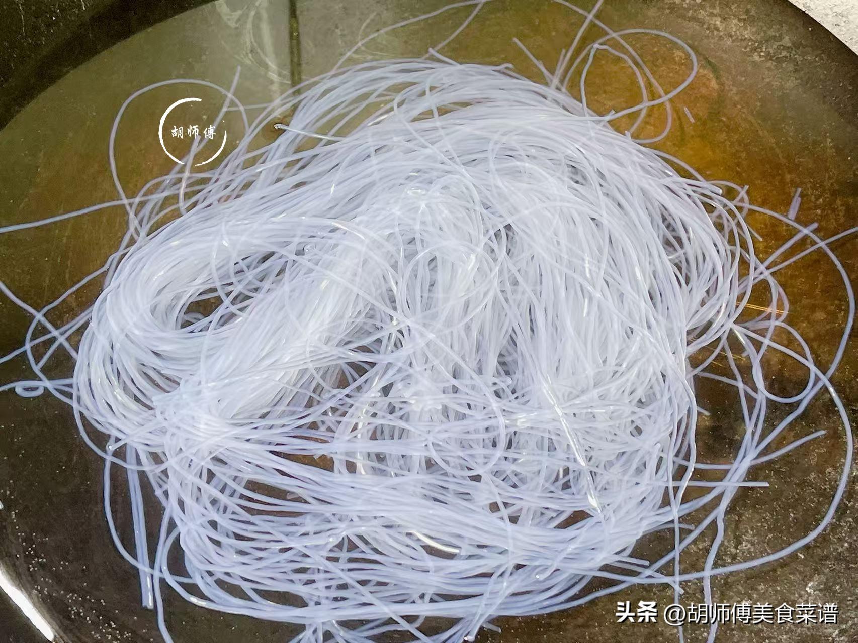 第一步:把粉絲放入清水中浸泡半小時左右,直到粉絲完全泡脹後,就可以將粉絲撈出,然後用自來水將粉絲沖洗乾淨後,瀝乾裏面的水備用。