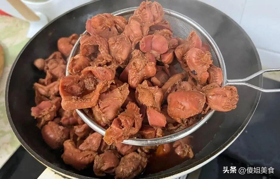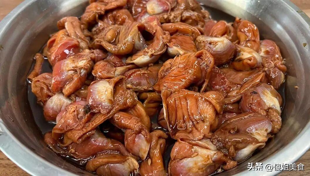 這裏提醒一句,醃製的時候彆着急,中途可以翻拌一次,讓雞胗兩面都能吸滿調料汁,這樣後面煮的時候味道才透。