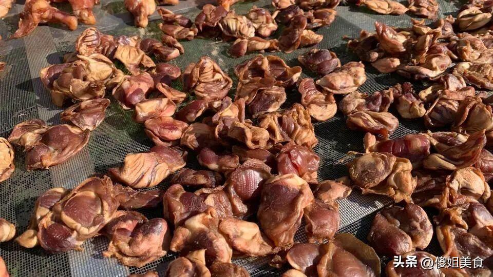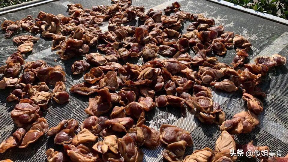 曬個2-3天,具體看天氣,晴天的話曬得快,陰天就多曬一天。怎麼判斷曬好了呢?拿起來掂量一下,比剛煮出來的時候輕了不少,摸起來乾乾爽爽,捏着有韌勁,沒有軟塌塌的感覺,顏色變成深醬色,就說明曬好了。要是遇到陰雨天,別硬曬,收回來用烤箱低溫烘一會兒,或者用風扇吹,別讓雞胗受潮壞了。