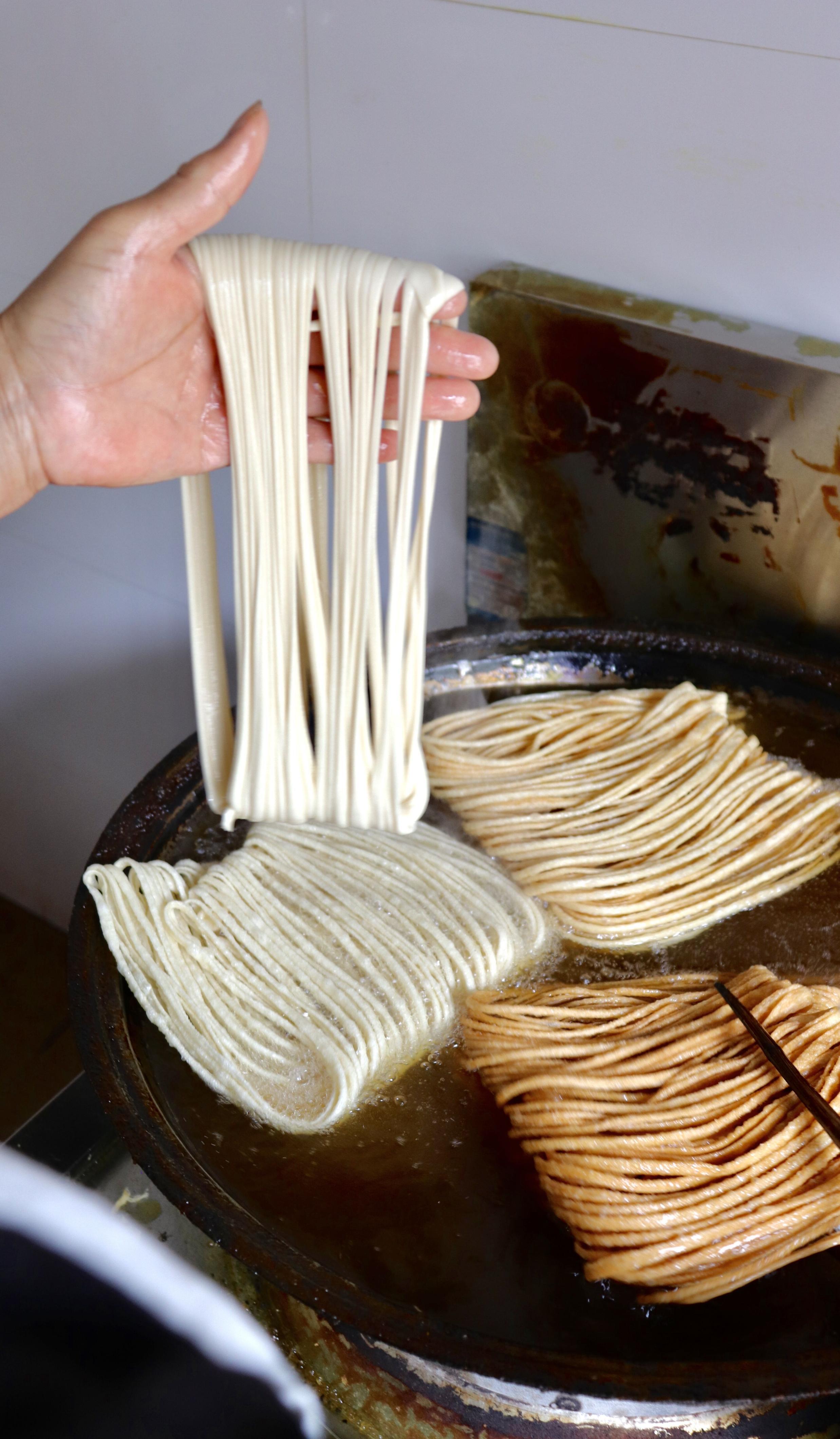 5最後,將拉好的麪條放入熱油中炸至金黃酥脆,撈起即可。