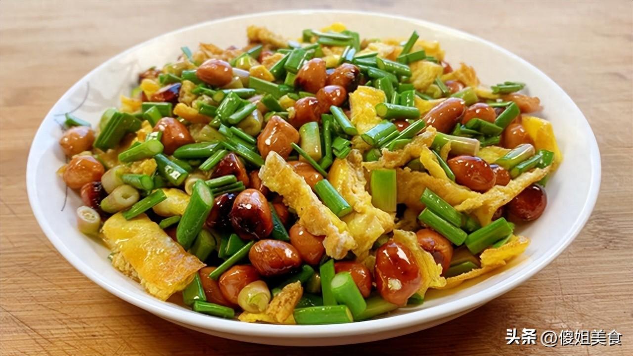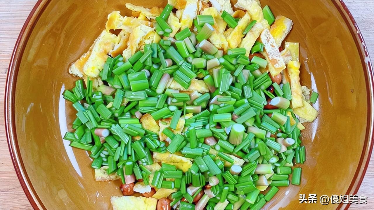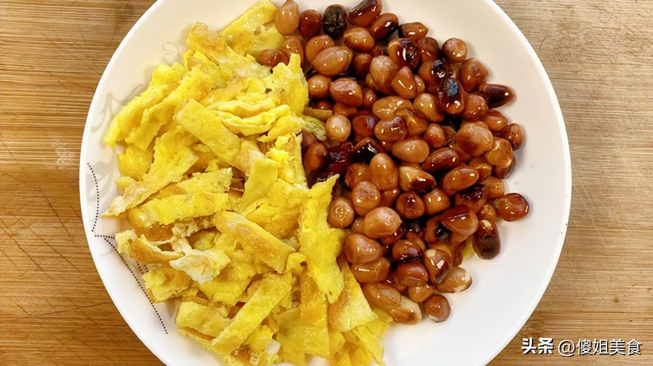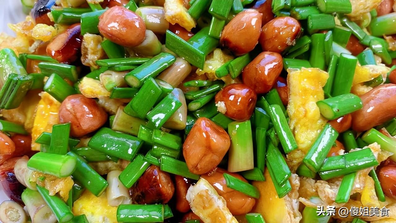 【涼拌蒜薹尾巴】準備食材:蒜薹尾巴一把、雞蛋、油炸花生米一小碗、味極鮮醬油2勺、米醋1勺、白糖半勺、香油1小勺、鹽少許(根據自己口味調整)