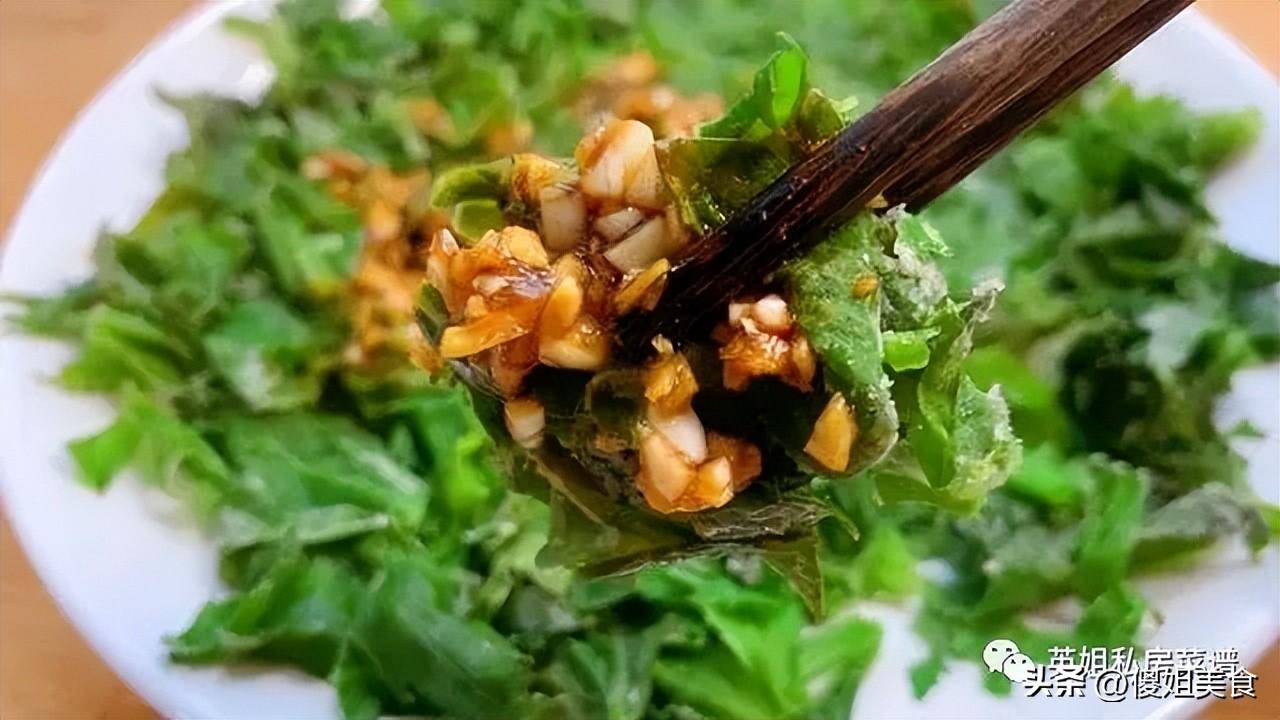 第二道:蒸芹菜葉子(不浪費菜,拌一拌就香,解膩又下飯)咱平時買芹菜,是不是都把葉子摘了扔了?可別浪費!芹菜葉子的香味比芹菜杆還濃,拌點麪粉上鍋一蒸,就是一道超下飯的家常菜,配粥、配餅都絕了,做法零難度!食材準備新鮮芹菜葉子一把(大概300g,就是買一把芹菜摘下來的葉子就夠)、玉米麪(或者普通麪粉)適量、鹽少許、蒜末、生抽、香醋、香油(調味用,按自己口味來)