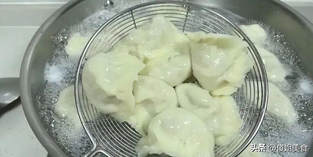 第五步:鍋裏燒足量的水,水開下入餃子,用勺子背輕輕推一下,防止粘鍋底。等水再次燒開,加一小碗涼水,蓋上蓋子,等水開了再加涼水,這樣重複三次,也就是老輩人說的“三起三落”,餃子就煮得差不多了。看到餃子一個個都鼓着肚子浮在水面上,就可以撈出來裝盤了。