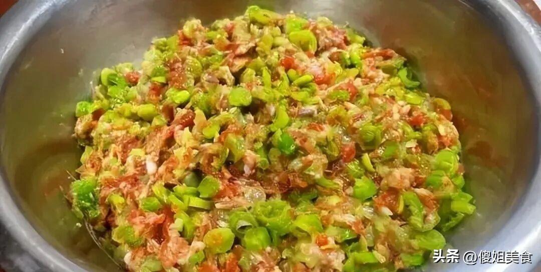 第三步:五花肉提前剁成肉餡兒,加蔥薑末、一勺料酒、兩勺生抽、鹽、食用油,用手順着一個方向使勁攪拌,給肉餡兒上勁兒,攪到肉餡兒發黏、能掛在筷子上就差不多了。醃個30分鐘左右,讓肉餡兒充分吸收調料的香味兒,再把切好的芸豆丁倒進去。這時候加適量的鹽,再淋上兩大勺熟食用油(提前把油燒熱,放涼了再用,更香),還是順着剛纔的方向,把芸豆丁和肉餡兒充分拌勻。拌好的餡兒,聞着就香,芸豆的清鮮混着肉香,光聞味兒就饞了。