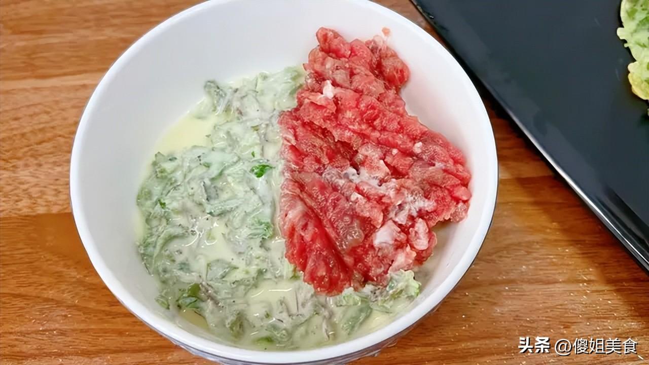 接着把切好的艾草碎倒進肉餡裏,繼續攪拌均勻。這時候能看到肉餡裏裹着翠綠的艾草碎,顏色特別好看,聞起來就是艾草混着肉香的清新味兒,光聞着就流口水。
