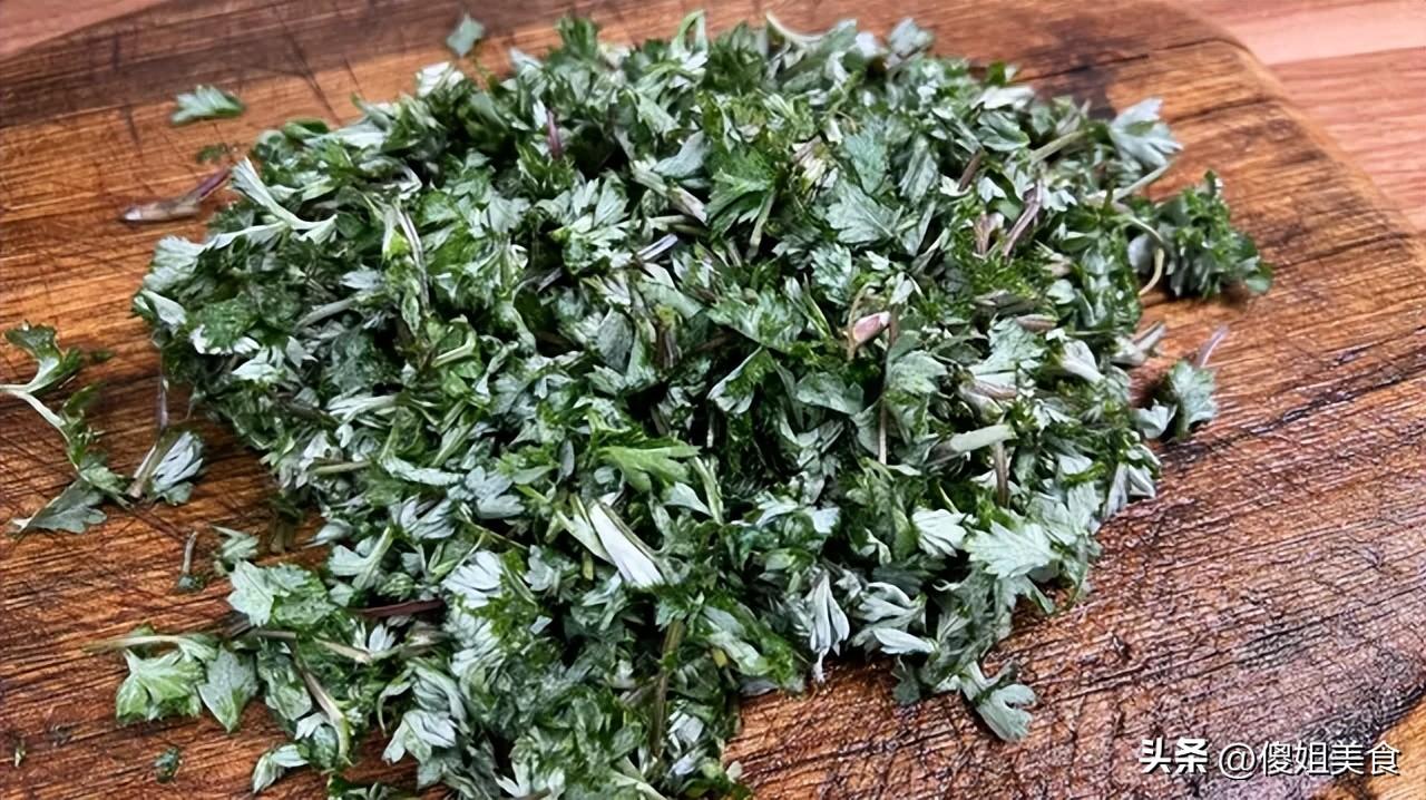 焯好水的艾草撈出來,用手使勁攥幹水分,然後放在案板上,用菜刀細細切碎。切的時候越碎越好,這樣艾草的香味能充分融在肉餅裏,喫起來也不會有粗糙的口感。我一般會切到艾草變成細碎的綠末,看着就特別治癒。