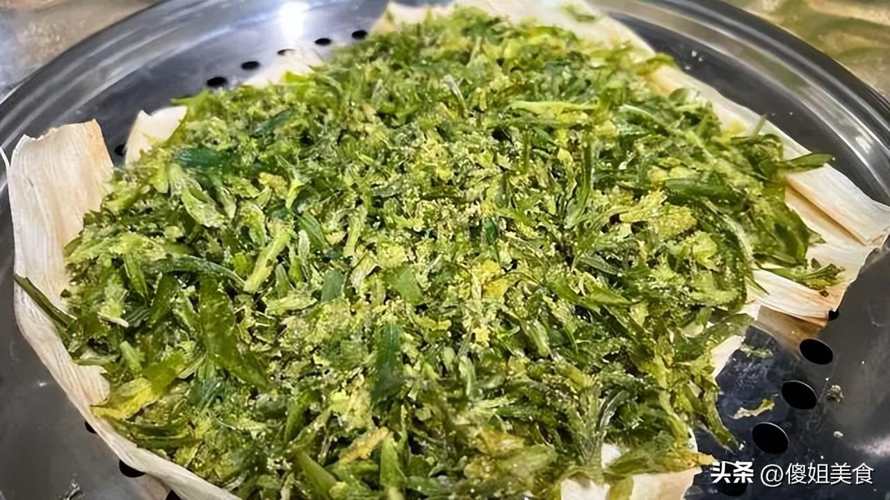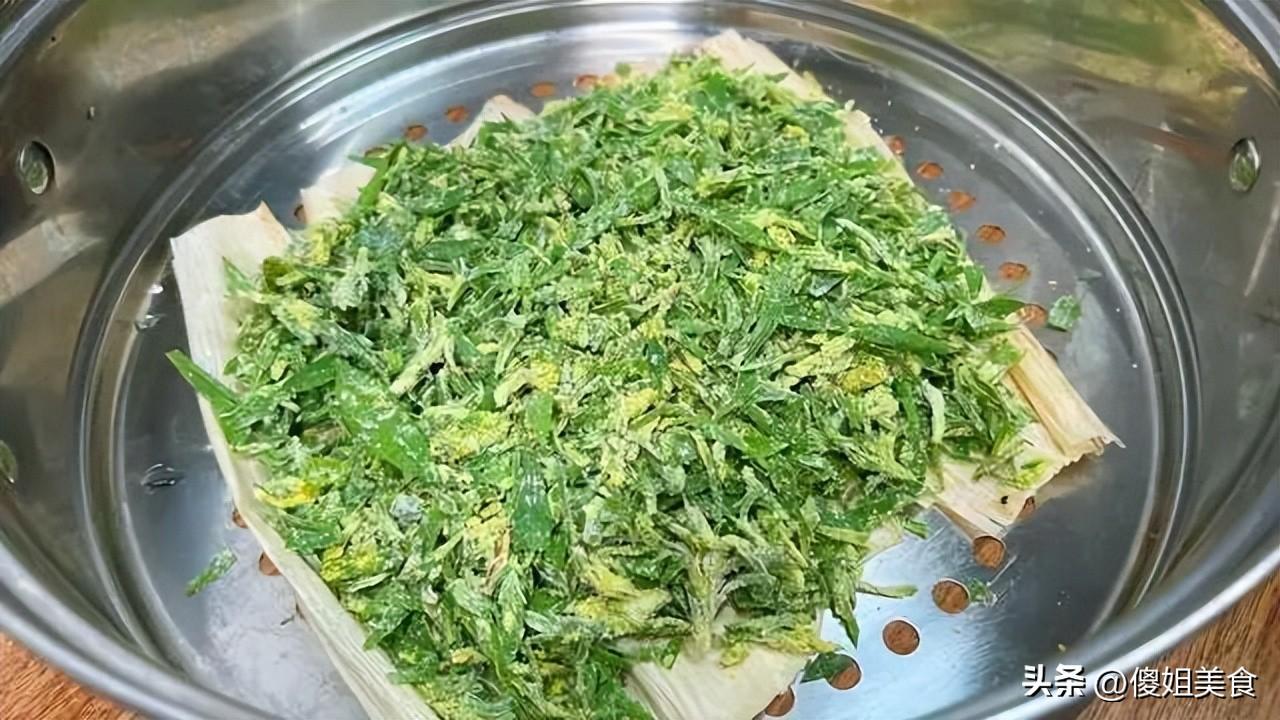 第三步:蒸鍋裏鋪上玉米葉,然後把拌好的掃帚苗鬆散地鋪在上面,別壓實,要蓬鬆一點,這樣蒸汽才能透進去,受熱均勻,熟得快。大火燒開鍋,上汽之後,轉中火蒸5分鐘就夠了,千萬別蒸久了,時間一長,菜就發黃、發黏,口感就差了,鮮味兒也沒了。
