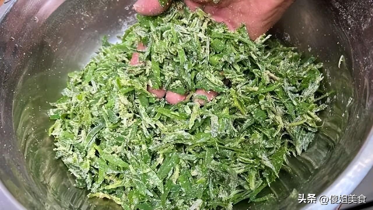 然後把麪粉和玉米麪分次撒進去,一邊撒一邊用手抓拌。記住,一定要用手抓,輕輕翻拌,讓每一根掃帚苗都均勻地裹上一層薄薄的粉,就像給菜穿上了一層薄薄的“黃金外衣”。抓拌到什麼程度呢?用手抓起一把,能成團,輕輕一捏就散開,葉子上都裹着粉,不粘手,就剛剛好。