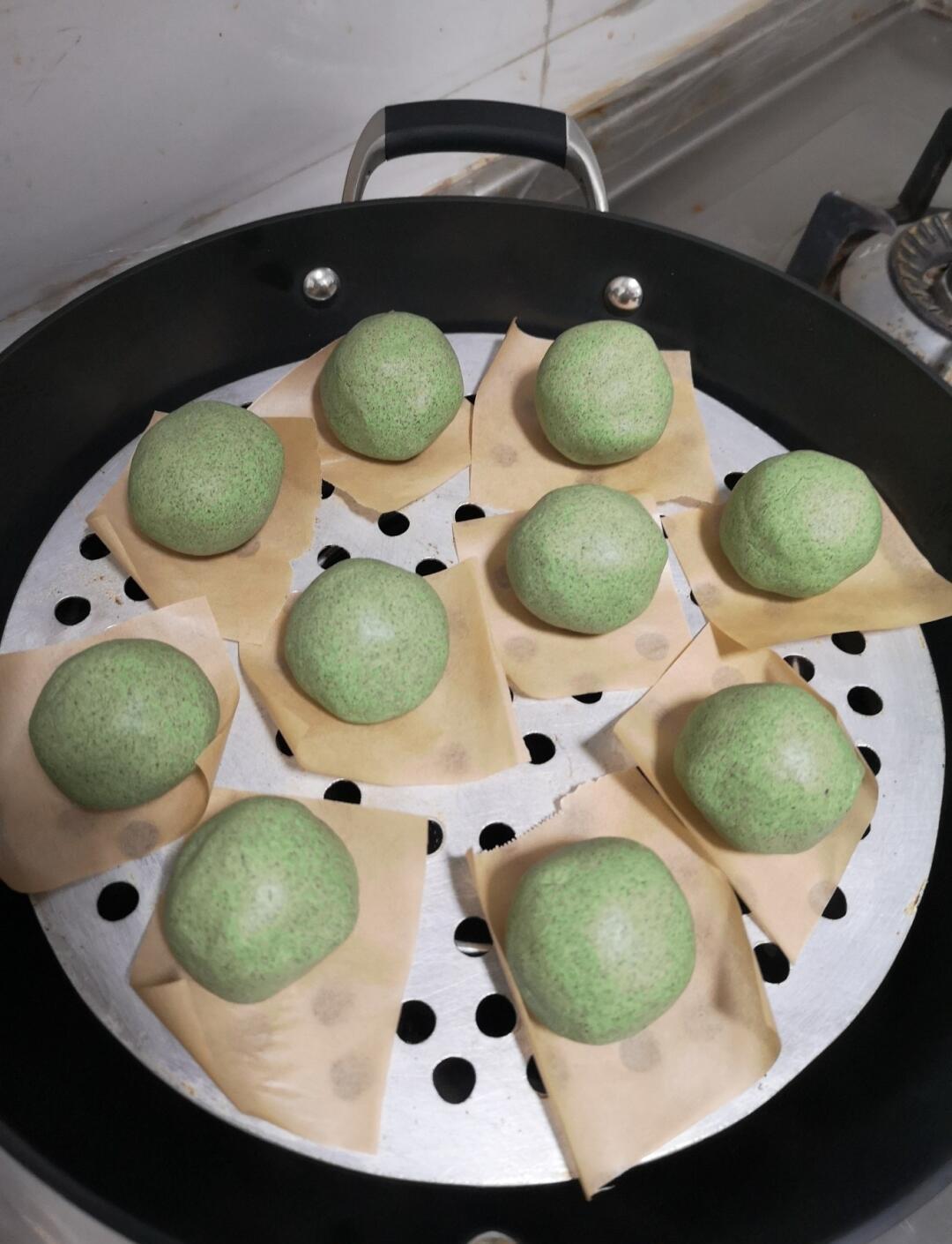 4蒸製成型。蒸鍋水燒開,青團底部墊油紙或糉葉防粘,中火蒸8-10 分鐘,出鍋後表面刷一層薄油,防止風乾變硬。