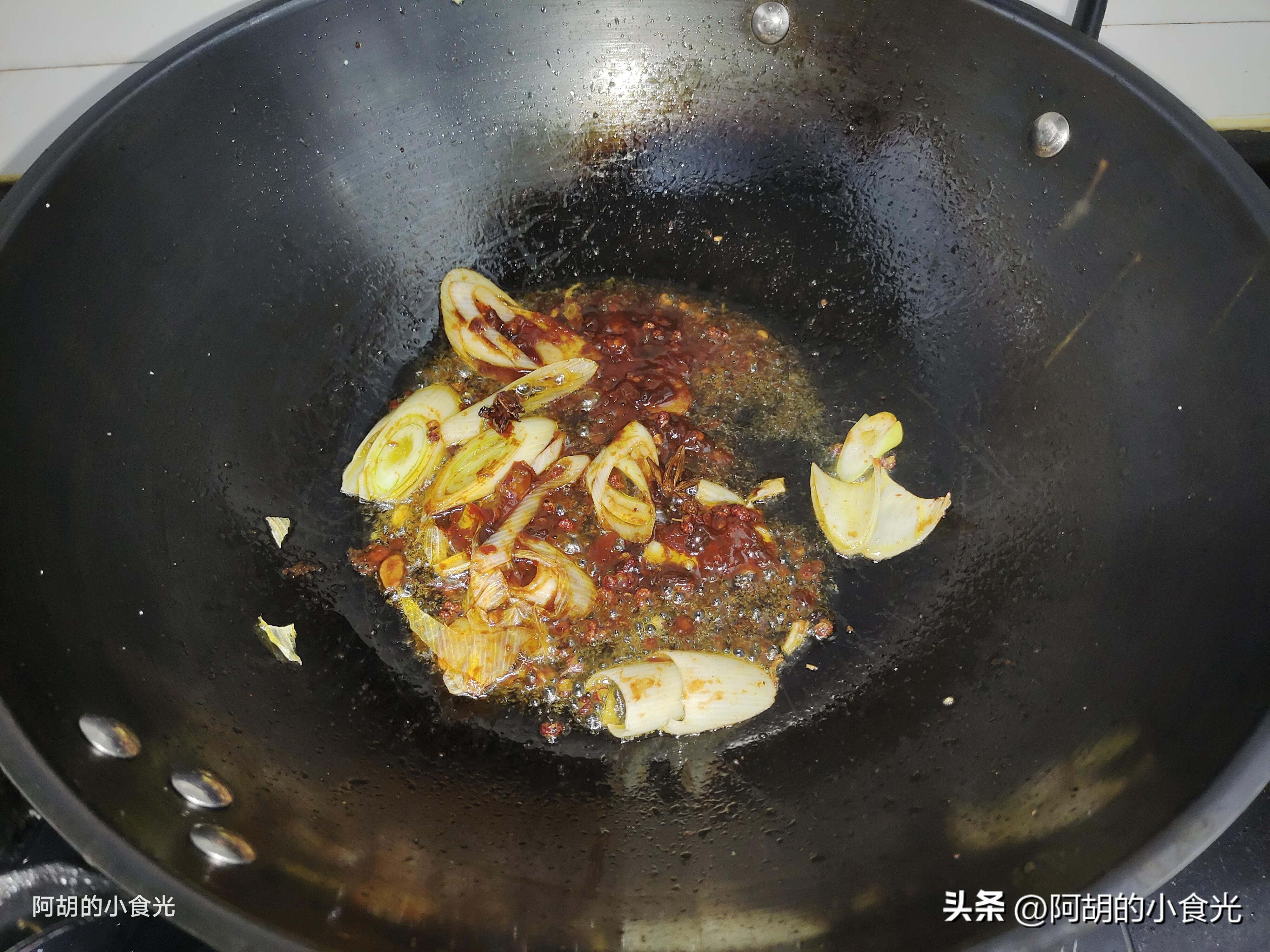 第三步:所有食材和配料備好後就可以開火烹飪,炒鍋烘乾後淋入一些豬油和菜籽油,這道菜最好用一些豬油來製作,味道會更好一些。油熱後下入豆瓣醬、黃豆醬、蔥薑蒜和八角、花椒炒出香味,炒出紅油,再沿着鍋邊熗入適量的生抽
