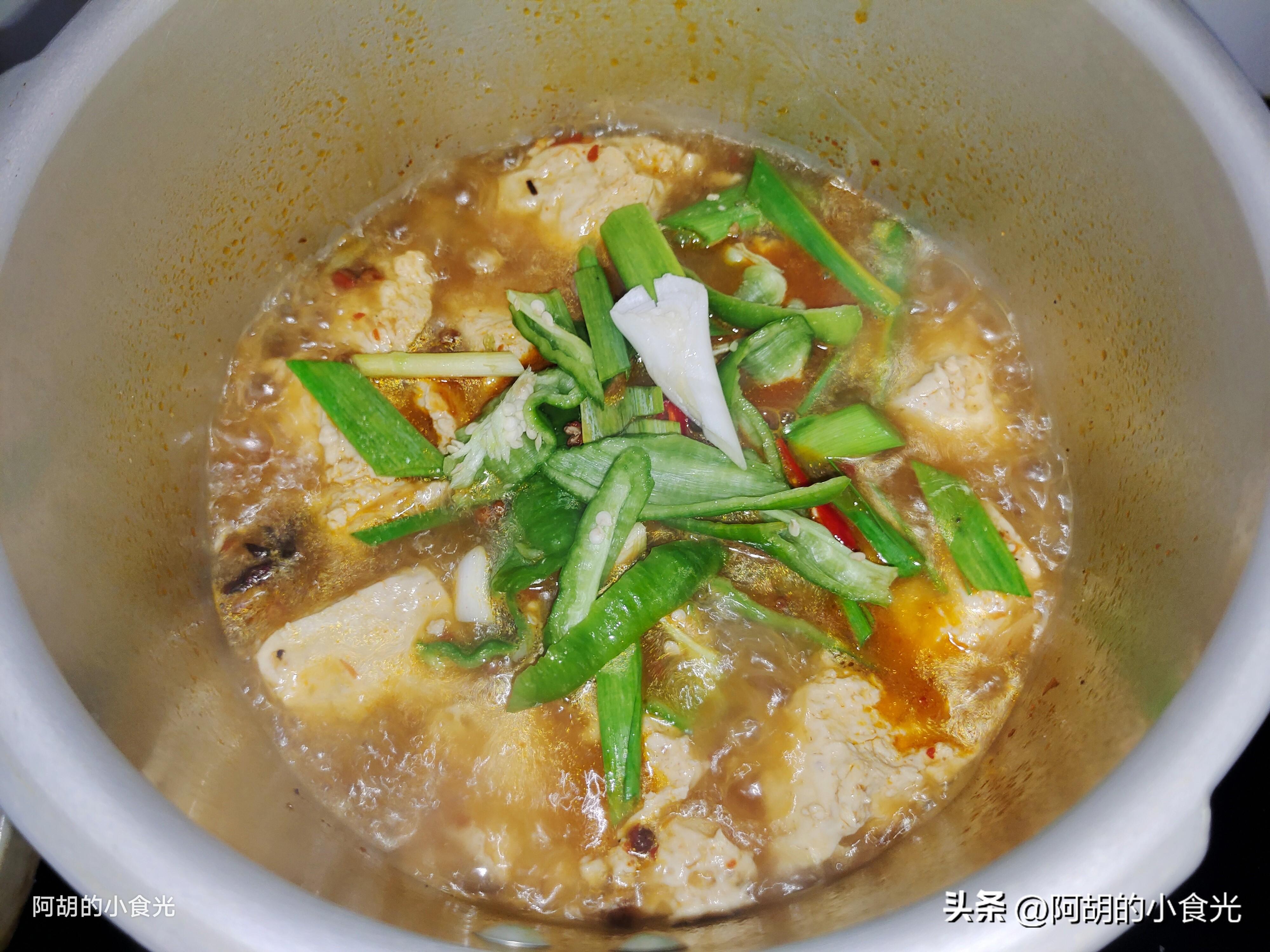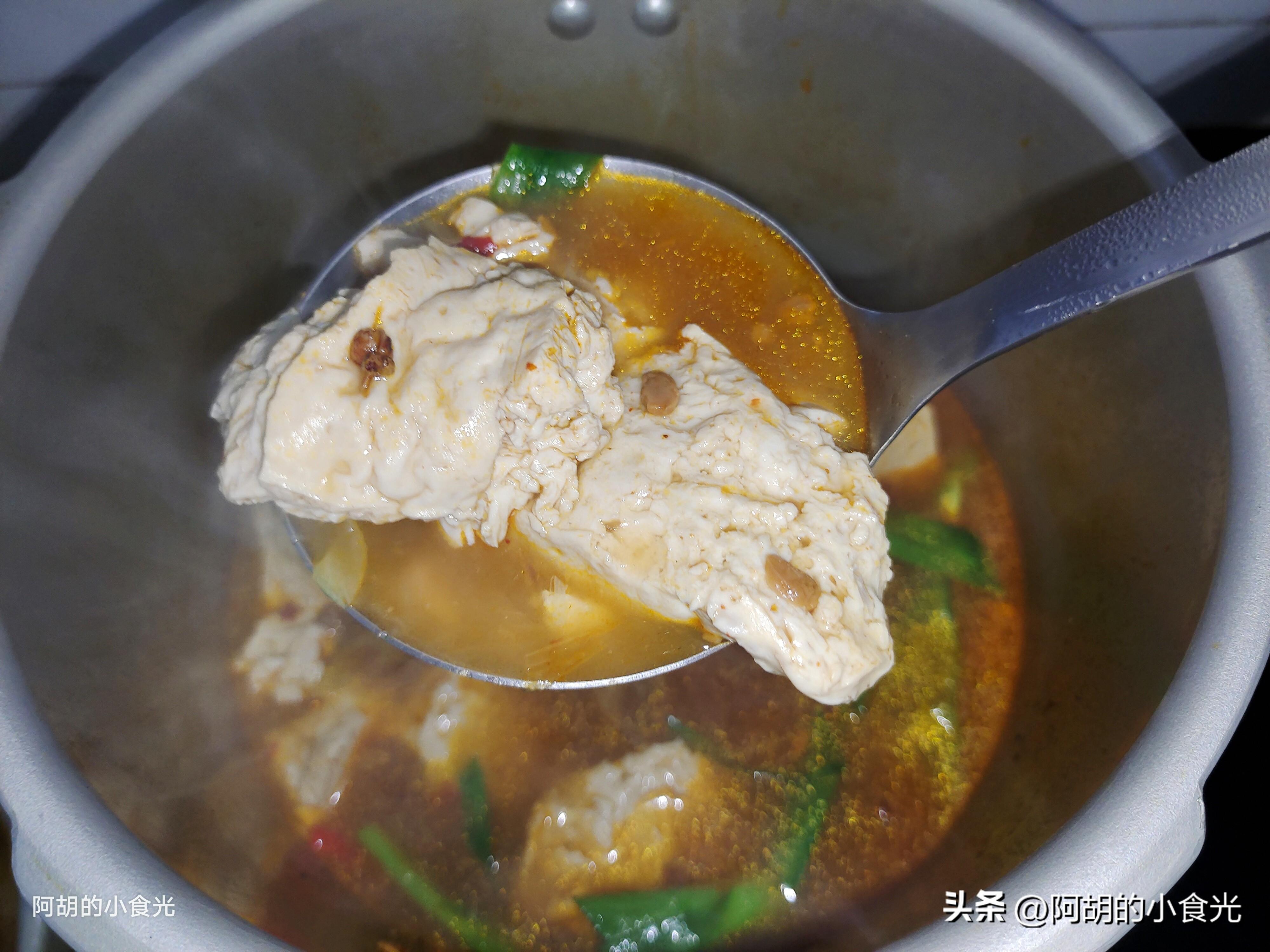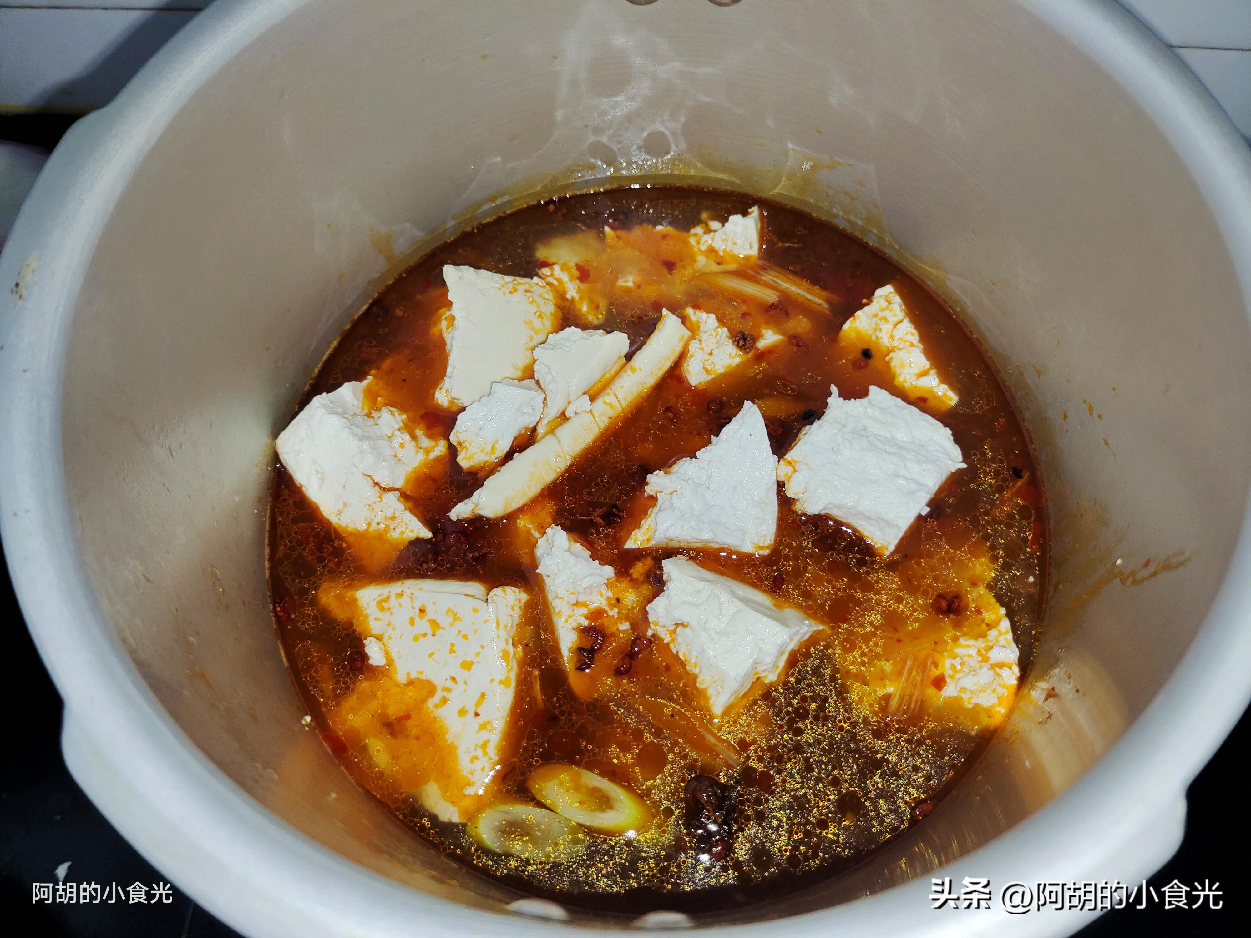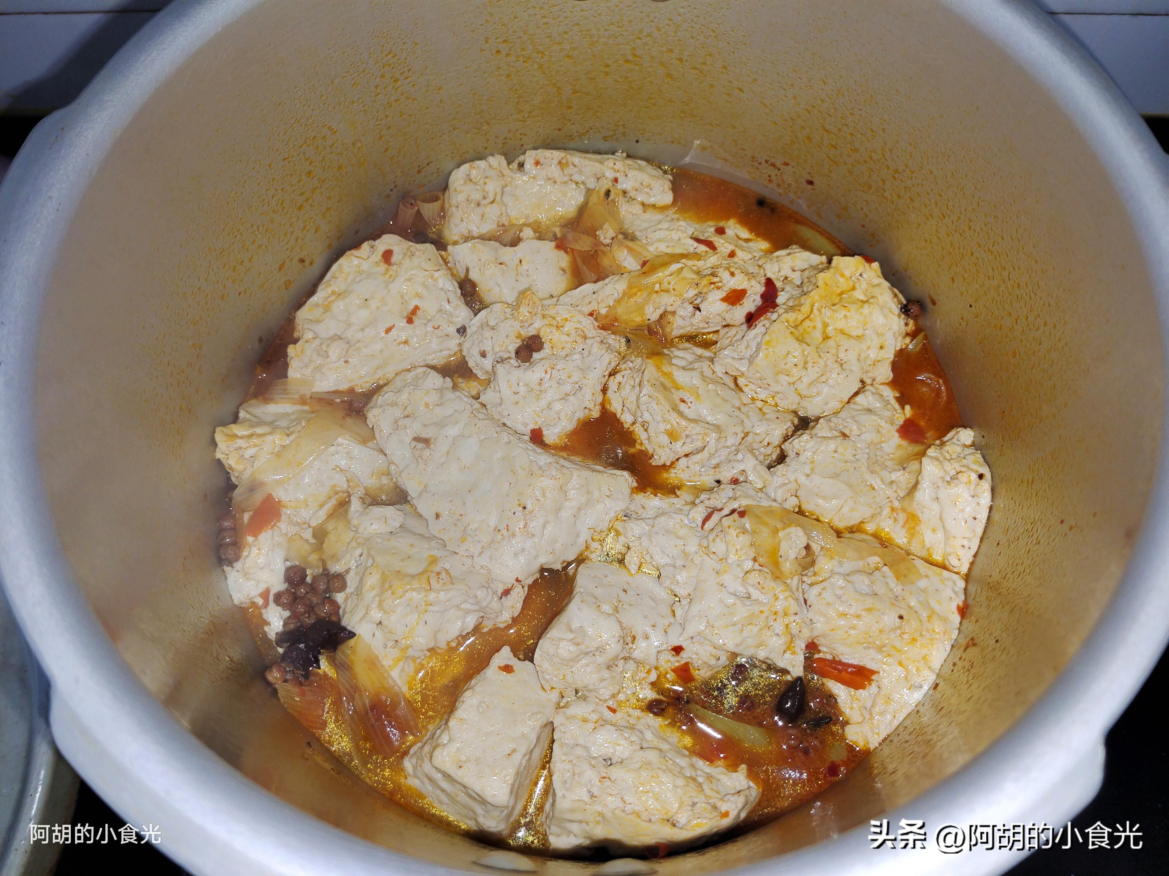 第五步:下面纔是這道壓鍋豆腐的靈魂所在,高壓鍋加蓋後保持大火燉煮至其上汽,而後轉爲小火壓個五分鐘時間即可,放汽後開蓋,這時豆腐塊有些變大,而且更爲軟嫩起來,關鍵是豆腐表面和內部出現了很多小孔,可以吸收湯汁的滋味。
