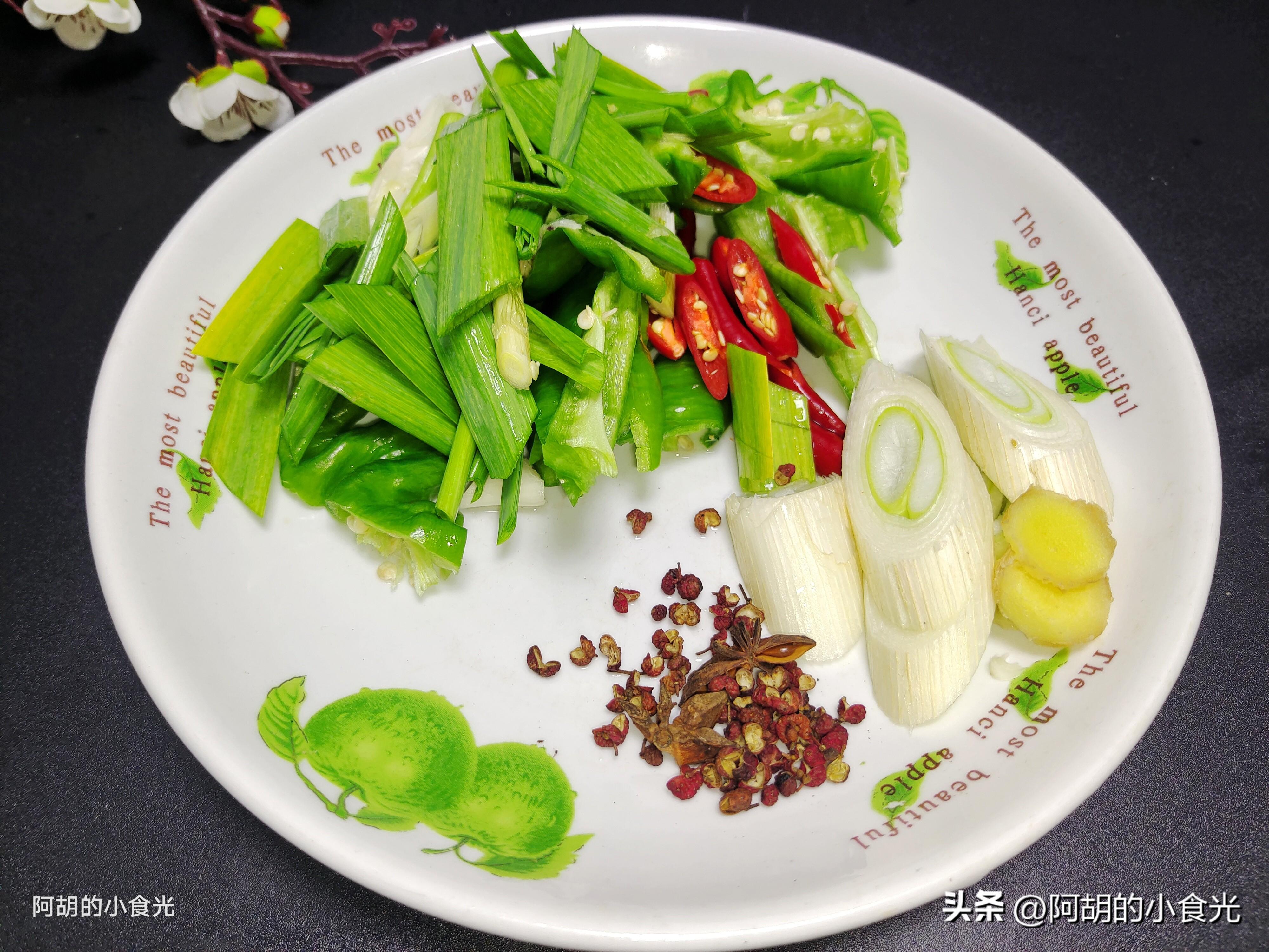 第二步:再來準備一些配料,有青紅椒適量切塊,喜歡辣味的可以用紅米椒代替,再搭配一些青蒜苗切小段即可,而後還有一個八角,一小把的乾花椒,適量的蔥薑蒜,還有一湯匙的郫縣豆瓣醬和黃豆醬也要提前備好。