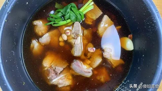 要是用普通鐵鍋,大火燒開之後,轉小火,蓋上蓋子,慢慢燉就行。燉到什麼時候呢?用筷子一戳,肉能輕鬆脫骨,豆子一抿就化,就差不多了。