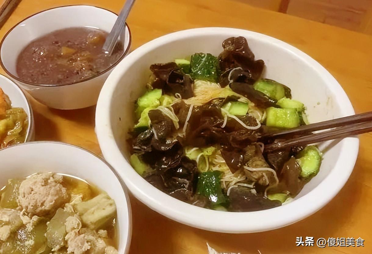 接下來就是硬菜環節啦!第一個必須是婆婆的拿手涼拌菜:黃瓜拌粉絲木耳。這道菜做法簡單到不行,但是味道絕了。