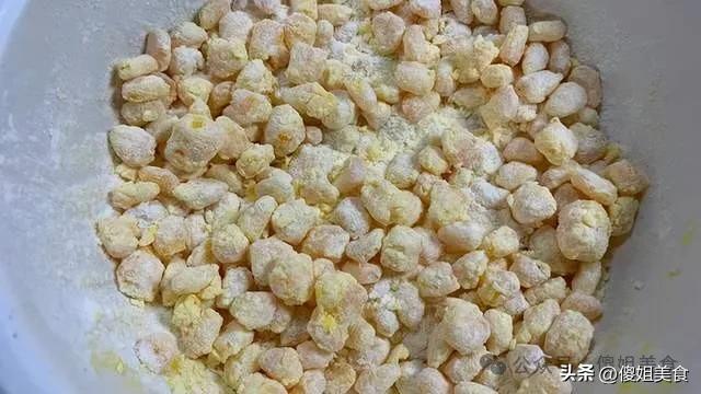 接下來就是關鍵的一步了,加玉米澱粉。咱一點點地加,一邊加一邊攪拌,讓澱粉均勻地裹在每一粒玉米上。咱要的效果是,每一粒玉米都分開,互不粘連,外面都裹上了一層白白的粉,就像圖裏那樣,粒粒分明,這就對了。