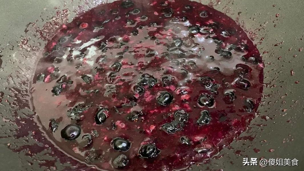 熬煮的過程中,要用硅膠鏟不停攪拌,防止粘鍋。隨着溫度升高,藍莓會慢慢煮爛,汁水越來越多,顏色也變成漂亮的深紫紅色。