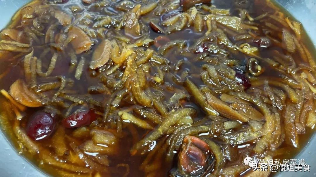 醃製好之後,你會發現盆裏有好多甜甜的梨汁,梨絲也變得軟軟的,就可以下鍋熬了。