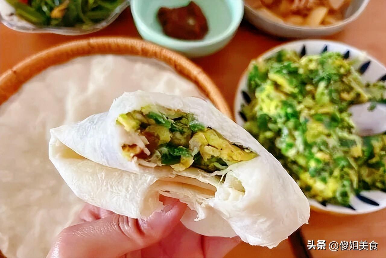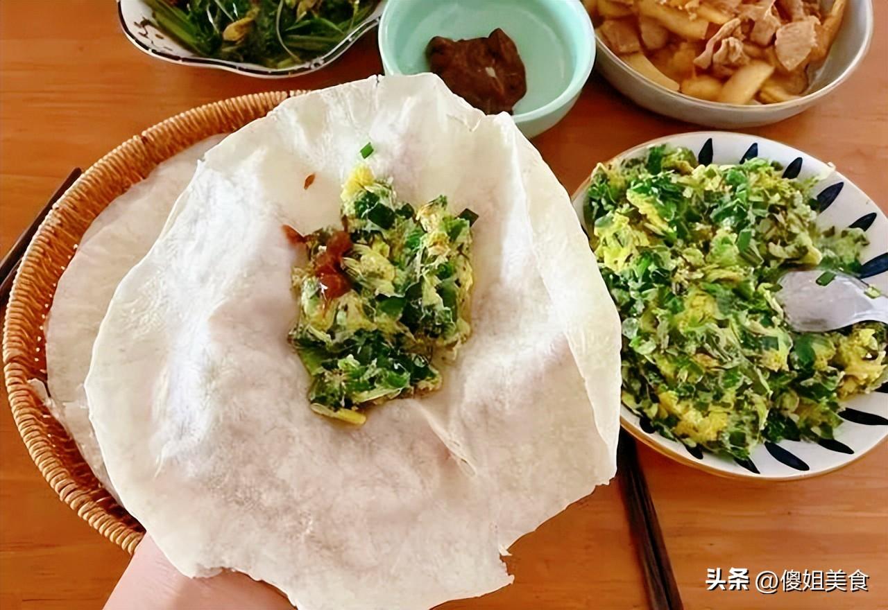 我媽做這菜,火候拿捏得剛剛好,韭菜脆嫩,雞蛋軟嫩,沒有多餘的調料,就是食材本身的鮮香。卷在春餅裏,一口下去,韭菜的鮮、雞蛋的香,配上餅的韌勁,越喫越上頭。