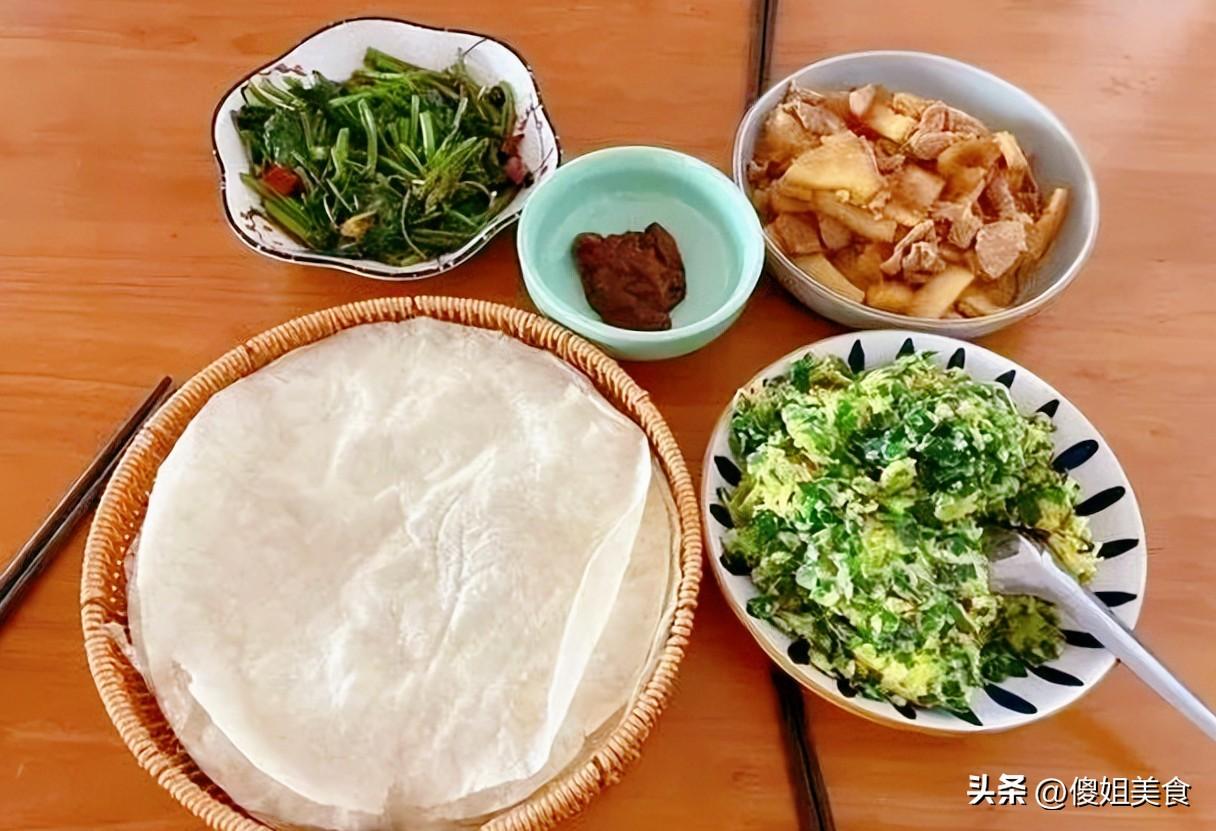 先看看我媽拍的這桌飯:剛烙好的春餅軟乎乎地躺在竹編簸籮裏,一盤韭菜炒雞蛋嫩得冒油,一小碟自家熬的辣醬紅亮誘人,還有清炒空心菜、冬瓜燉瘦肉,簡簡單單幾樣菜,我爸在旁邊打下手,我媽舉着新手機拍來拍去,連卷餅的步驟都沒落下,煙火氣直接拉滿。