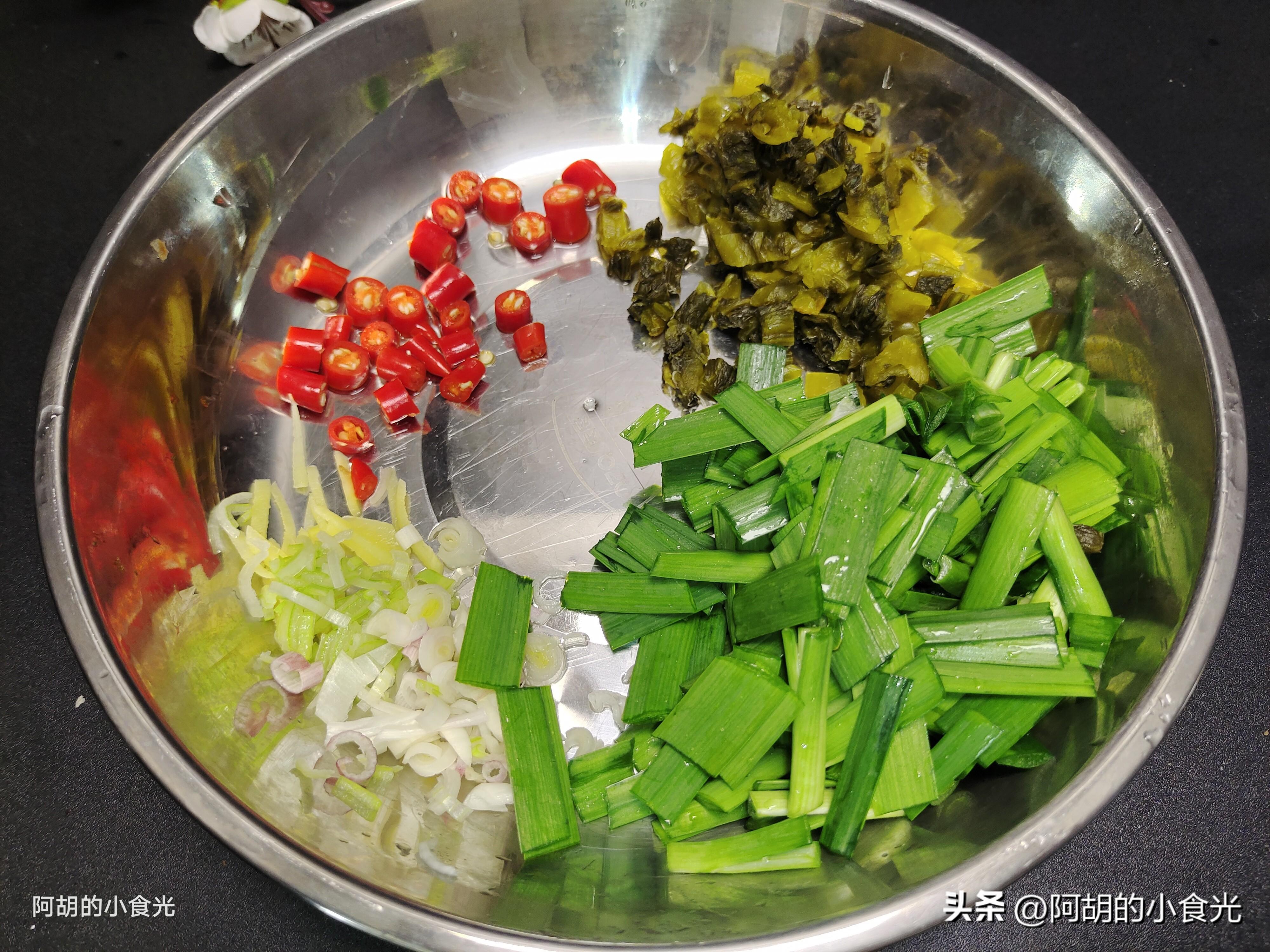 第三步:準備的另一個食材就是鮮蠶豆,去殼後再把蠶豆仁的外皮也去掉。再來一片老壇酸菜菜葉,清洗乾淨後切碎待用。適量的蔥蒜和紅米椒作爲小料使用。還有幾根韭菜洗淨後切段待用。