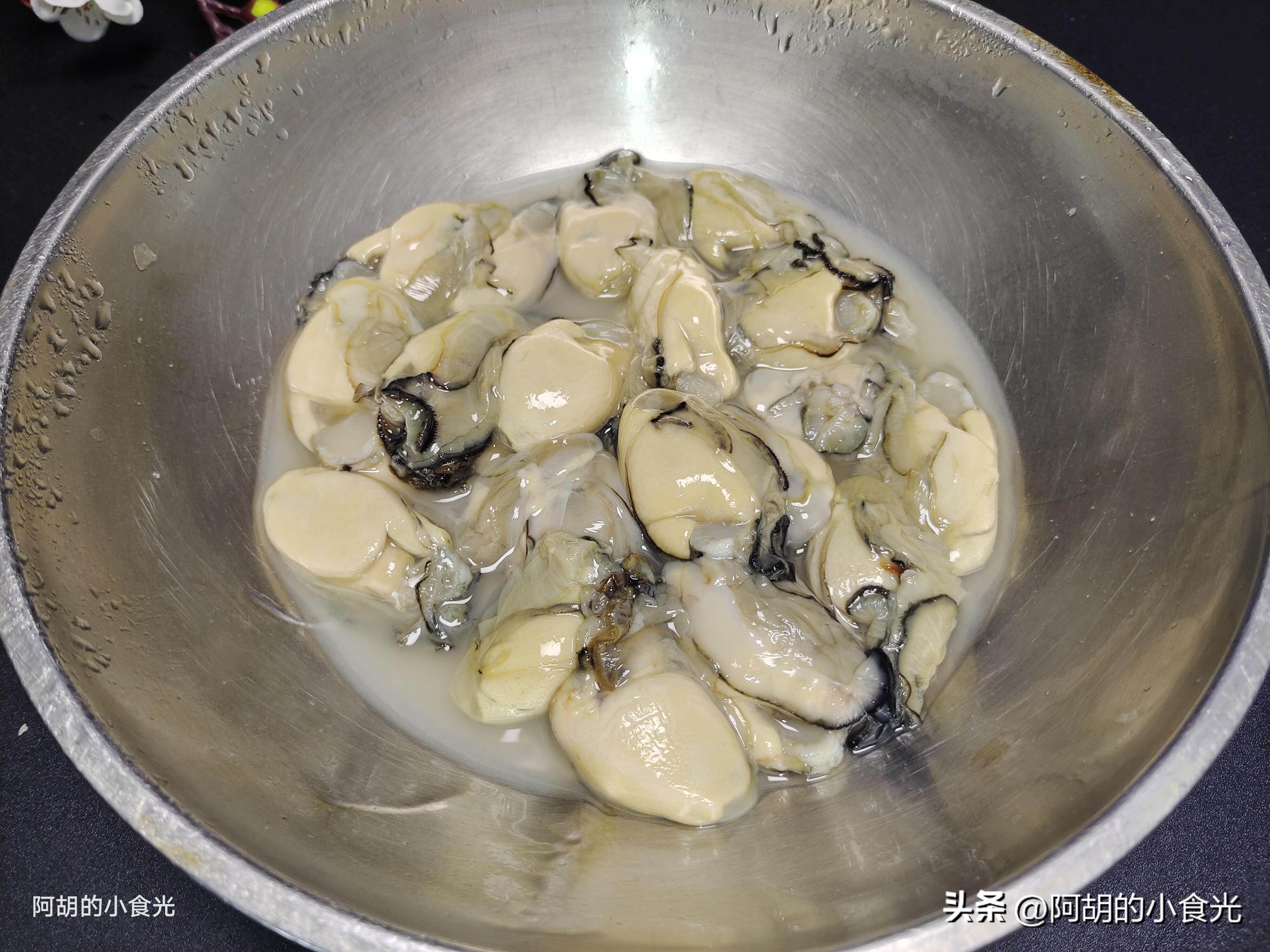 第一步:準備一些蠔肉,我這是冷凍的,用涼水浸泡解凍再清洗乾淨。你也可以用鮮活生蠔自己開蓋取肉,有點難度,先要用剪刀在蠔嘴那裏剪開一個口子,而後再把剪刀伸進去剪斷“閉鎖肌”,而後纔可以輕鬆開蓋取肉。