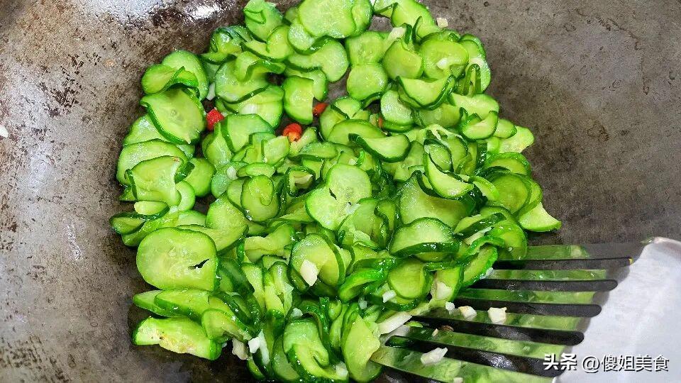 整個炒制過程加起來不超過2分鐘,全程大火,快進快出,才能最大程度保留黃瓜的脆嫩。
