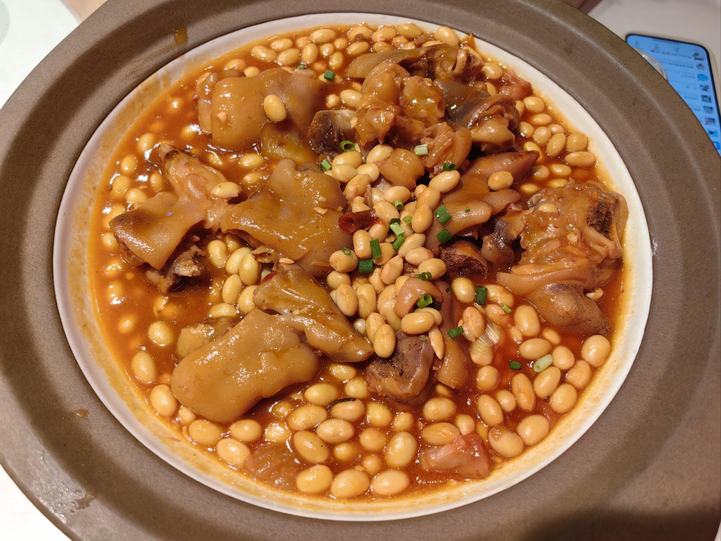 食材:豬蹄2個,黃豆適量,蔥, 姜,冰糖,鹽