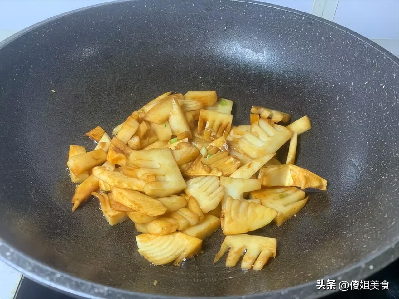 第二步:煸炒筍塊,逼出香味1. 鍋裏倒適量食用油,油熱後,把瀝乾水分的筍塊倒進去,開中小火慢慢煸炒。2. 煸炒到筍塊表面微微發黃,能聞到筍的清香味,就可以了。這一步很重要,把筍裏的水分煸出去,後面吸醬汁纔會更入味,口感也更脆嫩,不會水水的。