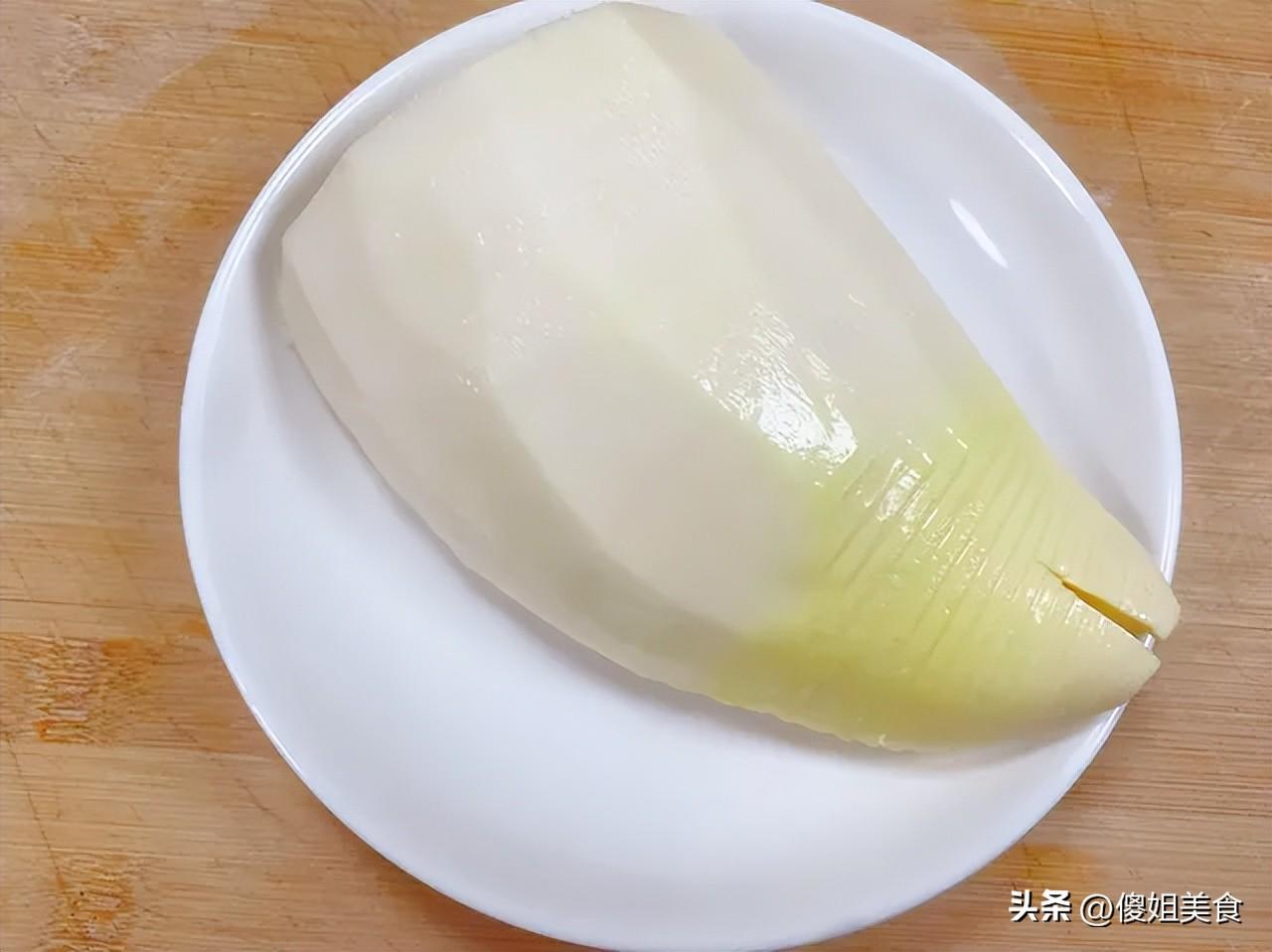 1. 先把筍殼剝掉,用刀削掉根部老硬的部分,只留中間嫩的筍肉。