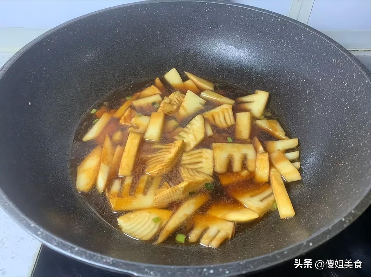 第三步:調味紅燒,燜出好味道1. 接着往鍋里加生抽、老抽、白糖,翻炒均勻,讓每一塊筍都裹上醬汁。2. 然後倒入小半碗清水,水量不用多,剛好沒過筍塊的一半就行。開大火燒開後,轉中小火燜2-3分鐘,讓筍充分吸收醬汁的味道。3. 最後開大火收汁,湯汁變得濃稠、緊緊裹在筍塊上的時候,加一點點鹽調味(嘗一下味道再放,別鹹了),撒上切好的小蔥花,翻炒兩下就可以出鍋啦!
