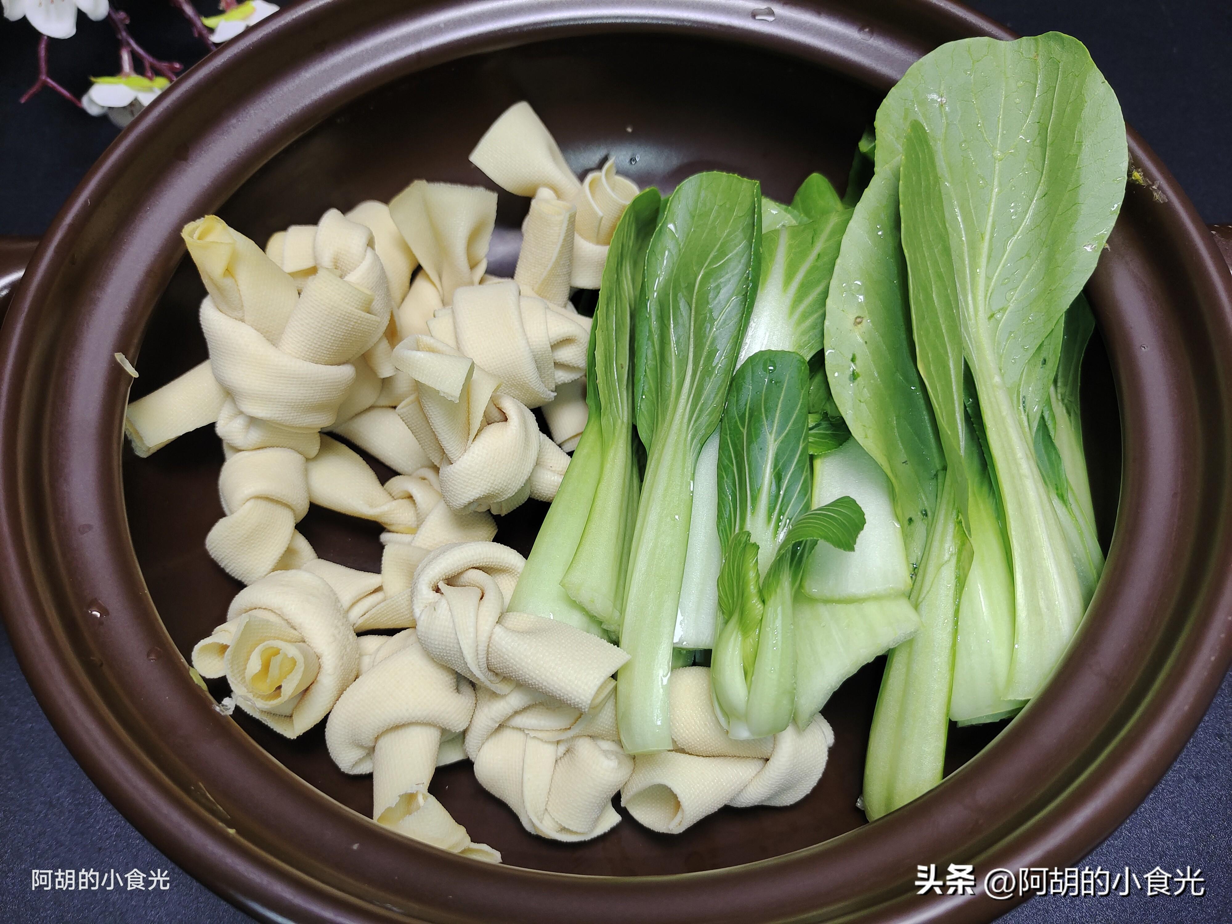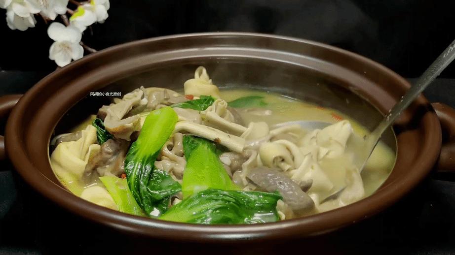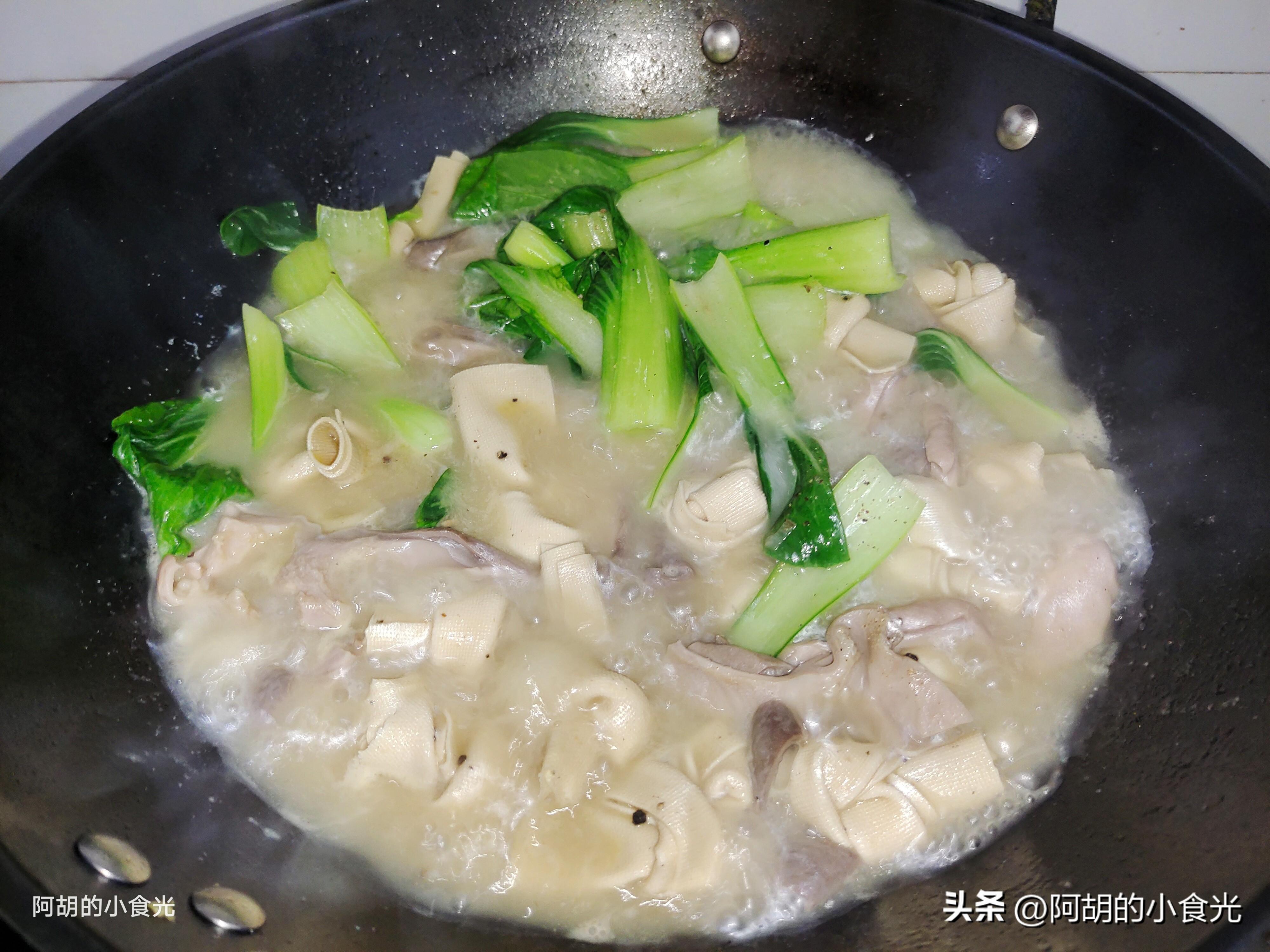 第六步:最後把青菜倒入鍋中,翻拌均勻後再撒入一些黑胡椒粉或者粗一些的黑胡椒碎,激發出香味後就可以出鍋裝盤了。有湯有菜的,湯汁也是特別鮮美開胃,尤其是脆嫩的豬肚條,和嫩而又有口感的千張結,春天來上這一鍋,滋補鮮美又開胃,感興趣的一定要試一試這個做法。