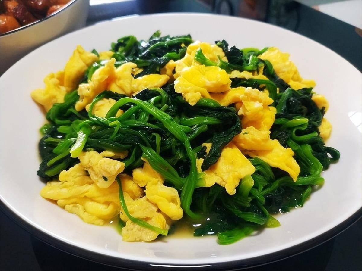 推薦喫法, 菠菜炒雞蛋。這道菜色澤鮮豔,口感鮮美,是一道養肝降火的家常菜。