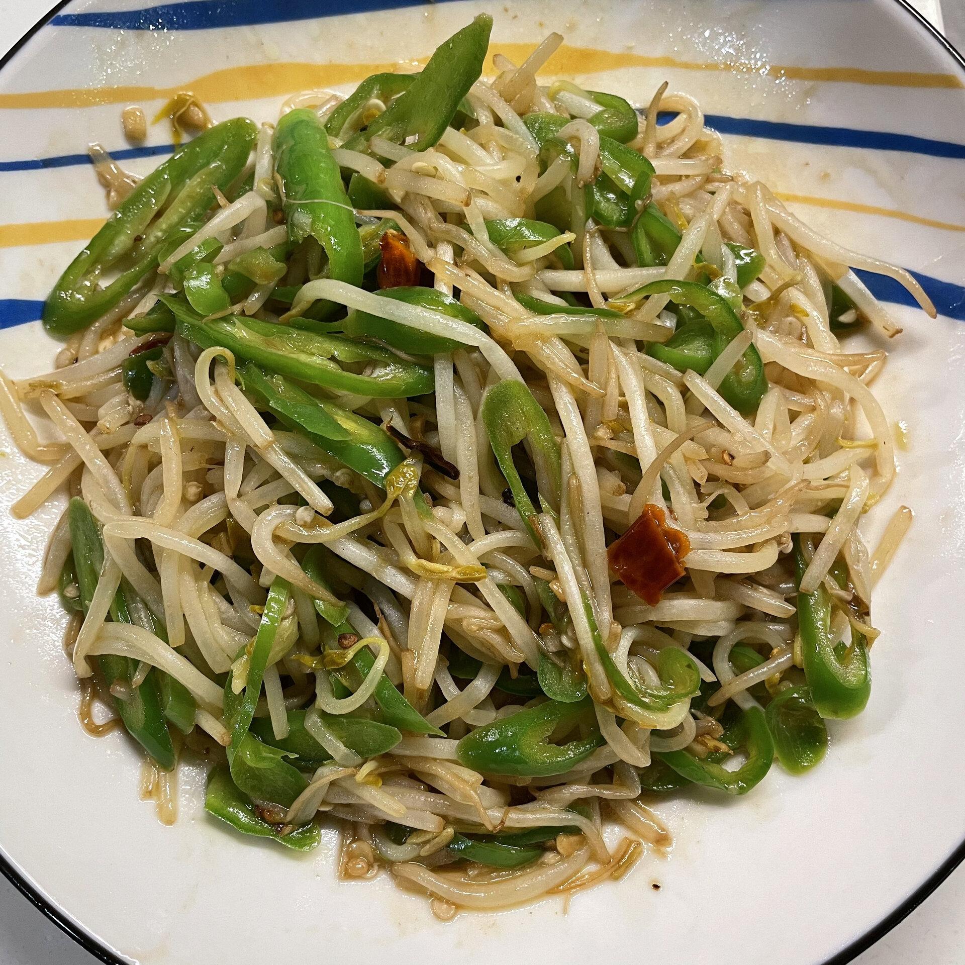 食材:綠豆芽,紅椒1個, 蔥薑蒜,鹽,醋,生抽