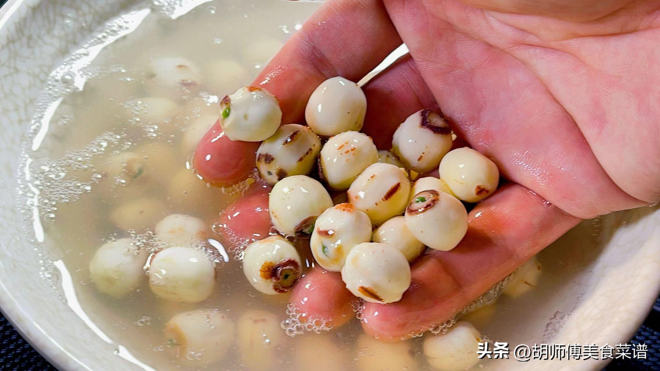 第三步:買蓮子,一定要買帶芯的蓮子,這種蓮子營養價值更高,因爲蓮子很硬,所以買回家的蓮子,需要用水浸泡10小時才能備用。