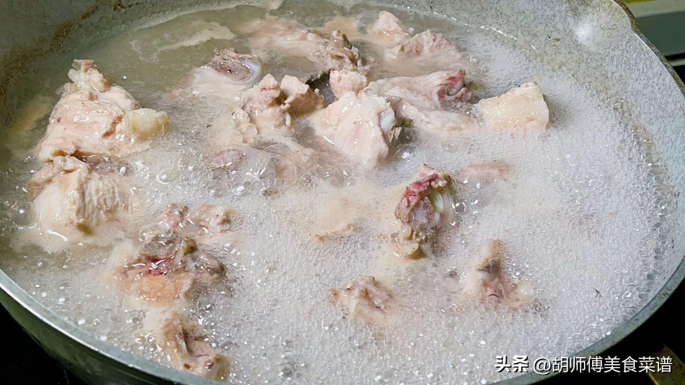 第二步:煮鮮湯時,建議大家用豬尾脊骨,因爲這個部位油脂多肉少,用來煮湯會更鮮,將買回家的豬尾脊骨沖洗乾淨後放入鍋中,同時加入適量冷水,將豬尾脊骨煮10分鐘後撈出,接着再用流水,將豬尾脊骨表面的浮沫都沖走即可備用。