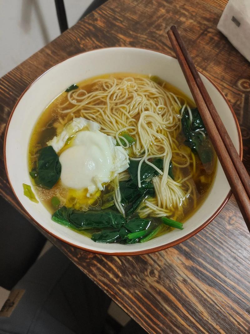 4裝碗:將煮好的麪條撈入調好湯底的碗中,加入適量的麪湯,再放上煎好的荷包蛋和燙熟的青菜,撒上蔥花,一碗鮮香可口的清湯長壽麪就完成了。